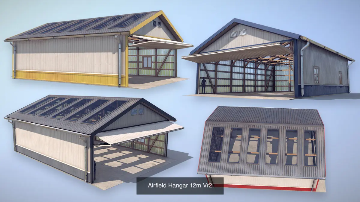 Low-poly 3D model Airfield Hangar with LODs and animation
