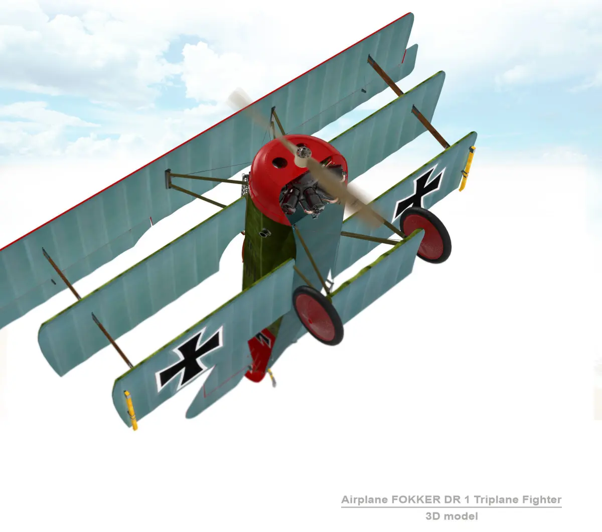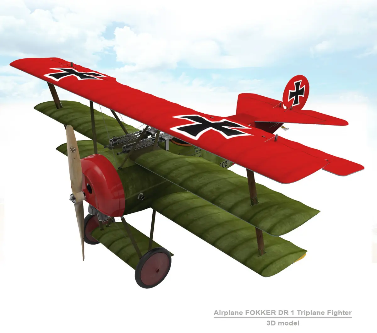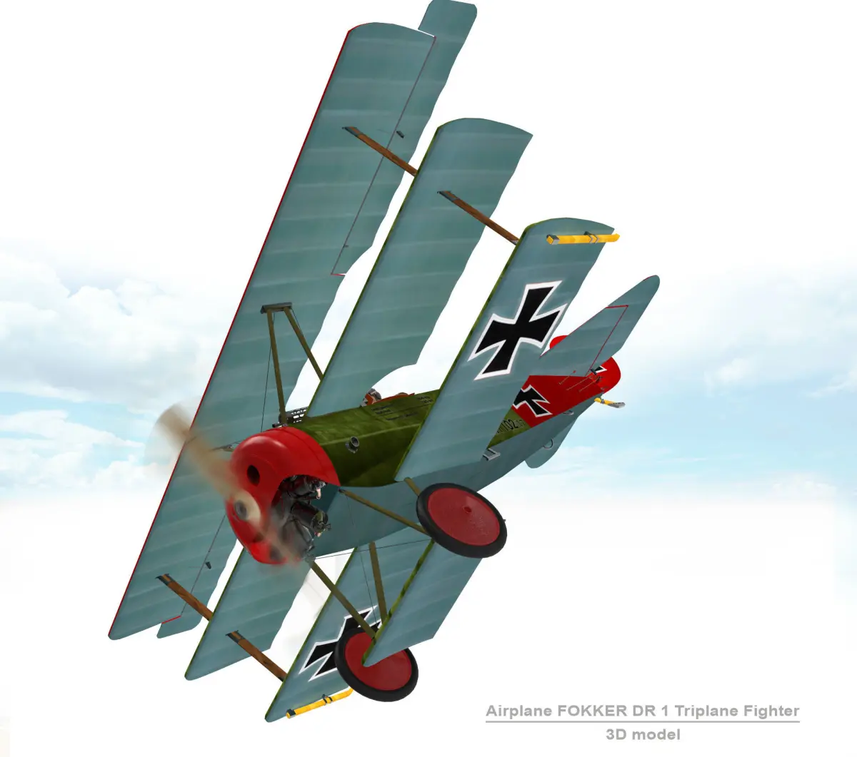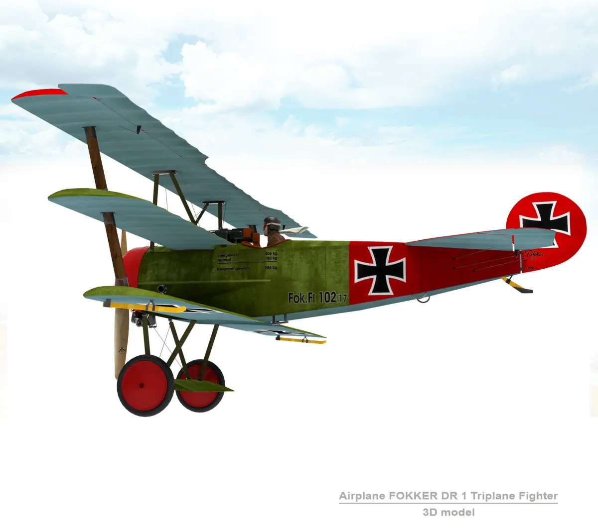 Fokker Dr.I triplane fighter 3D model for 3d max, World War I fighter aircraft.Available 3D file format:.max (3ds Max2009) standard scanline rendererTexture format: jpg, gif. The archive contains bodypaint textures and standard materials.