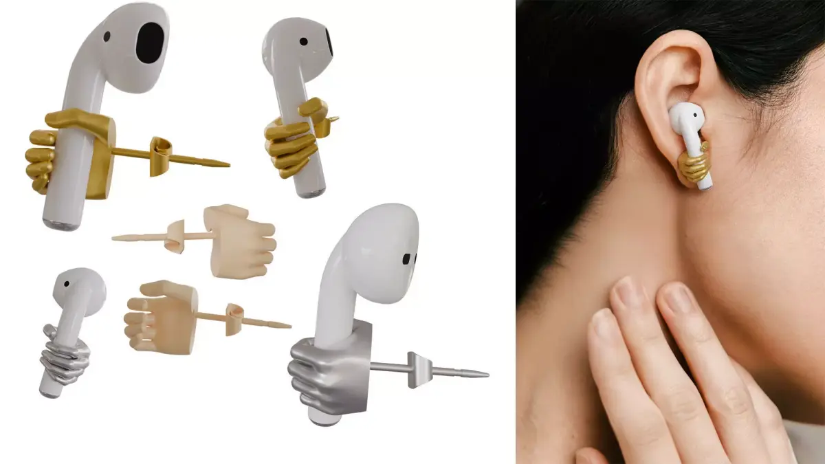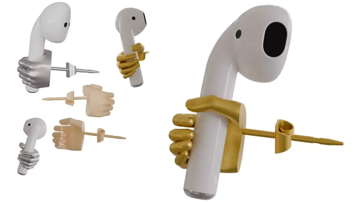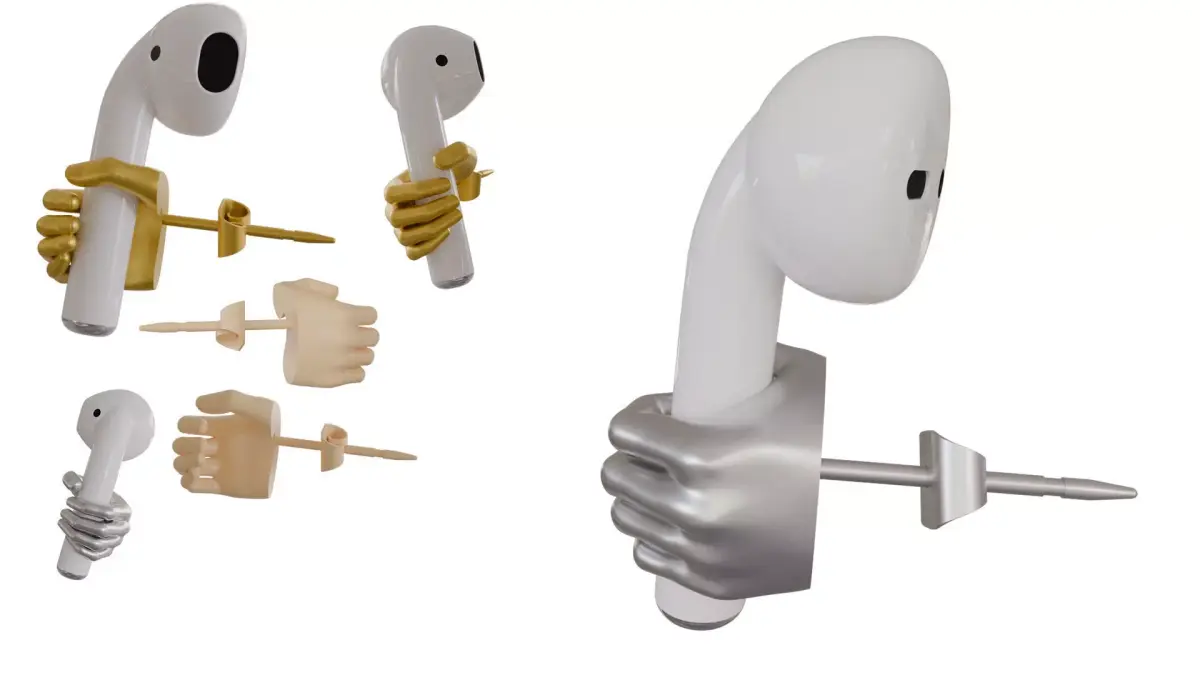 Merge tech convenience with cutting-edge fashion using the AirPods Grabber Earring 3D print model. This highly original design features a stylishly sculpted miniature hand that cradles the stem of a standard Apple AirPods earbud (or similar wireless earbud). The hand is connected to a post that pierces the ear, making the earbud look like it's being held in place by tiny, metallic jewelry.