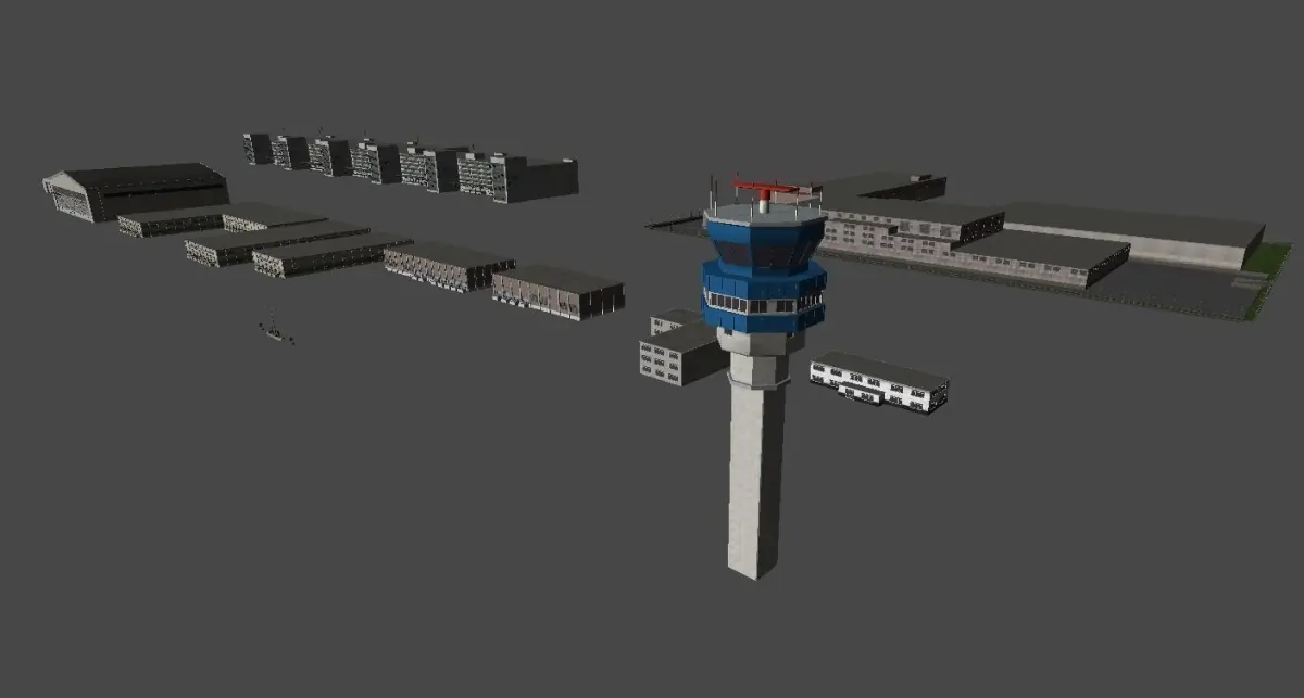 This package contains 13 different airport building like passenger terminal, cargo terminal,tower, warehouses and hangars.A fuel-station is also included.Textures-sizes between 512x512 to 2048x2048.