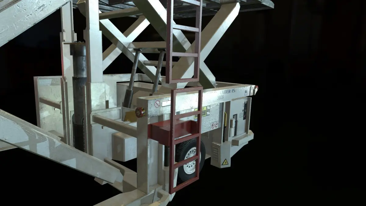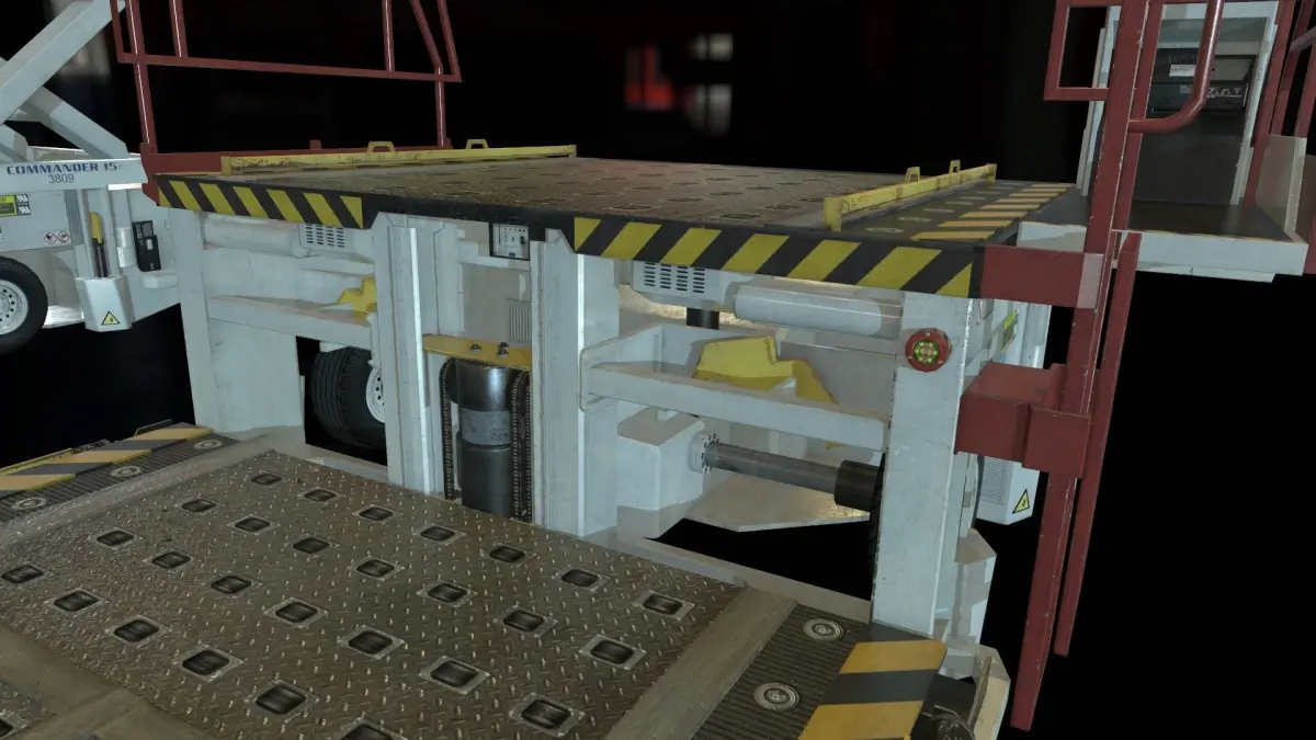 This is an airport cargo loader. These machines are used to transport large cargo containers between an airplane and airport. There are two versions, one with the ramp raised and the other one lowered.
