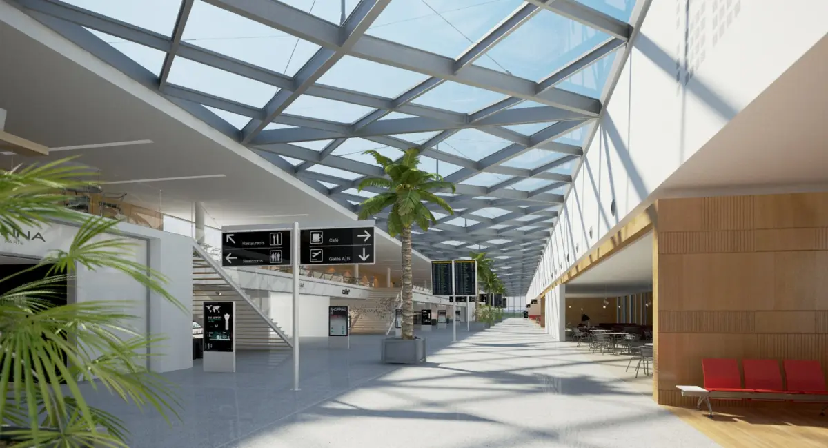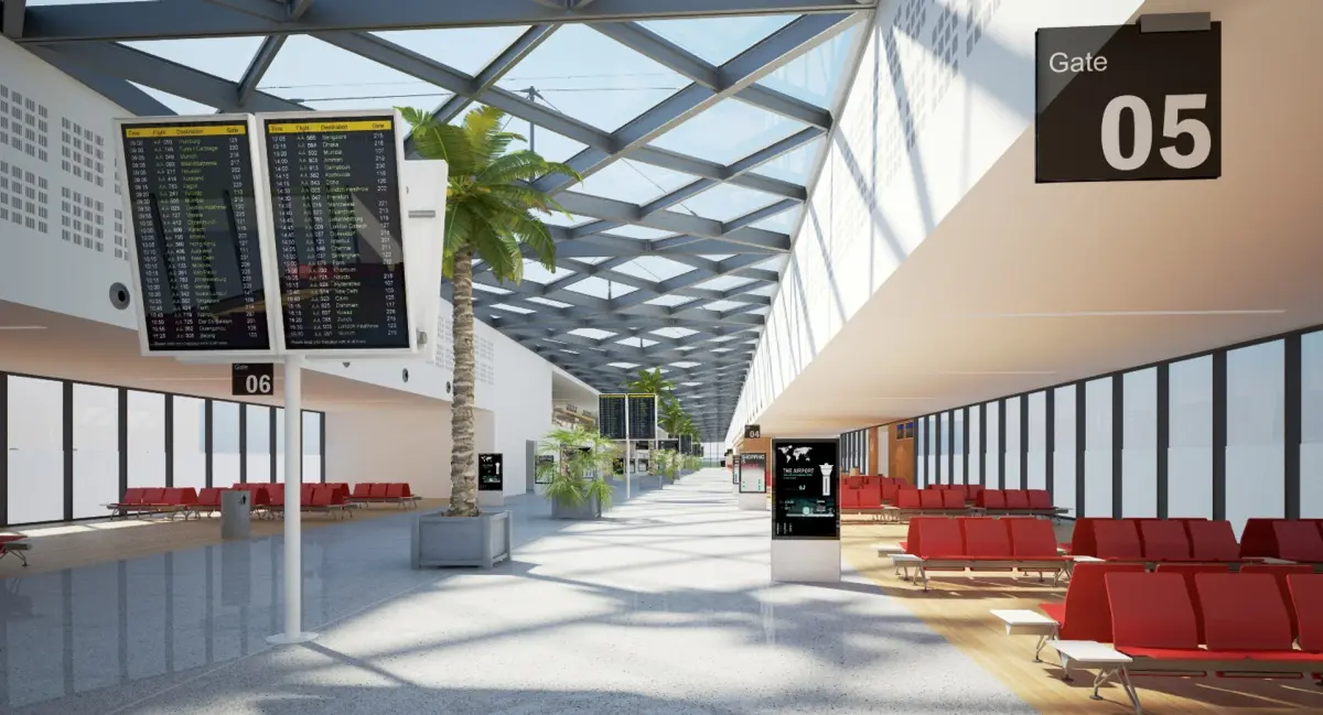 The interior includes a large departures lounge with cafs, restaurants and shopping & duty free areas plus boarding gates. Loaded with multiple types of signage and seating throughout the whole scene.