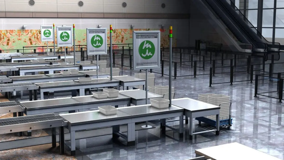 - Detailed security checkpoint setup with metal detectors, x-ray machines, and passport control stations