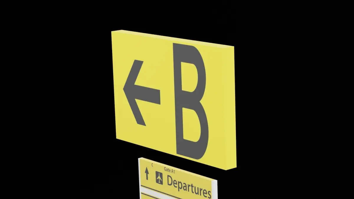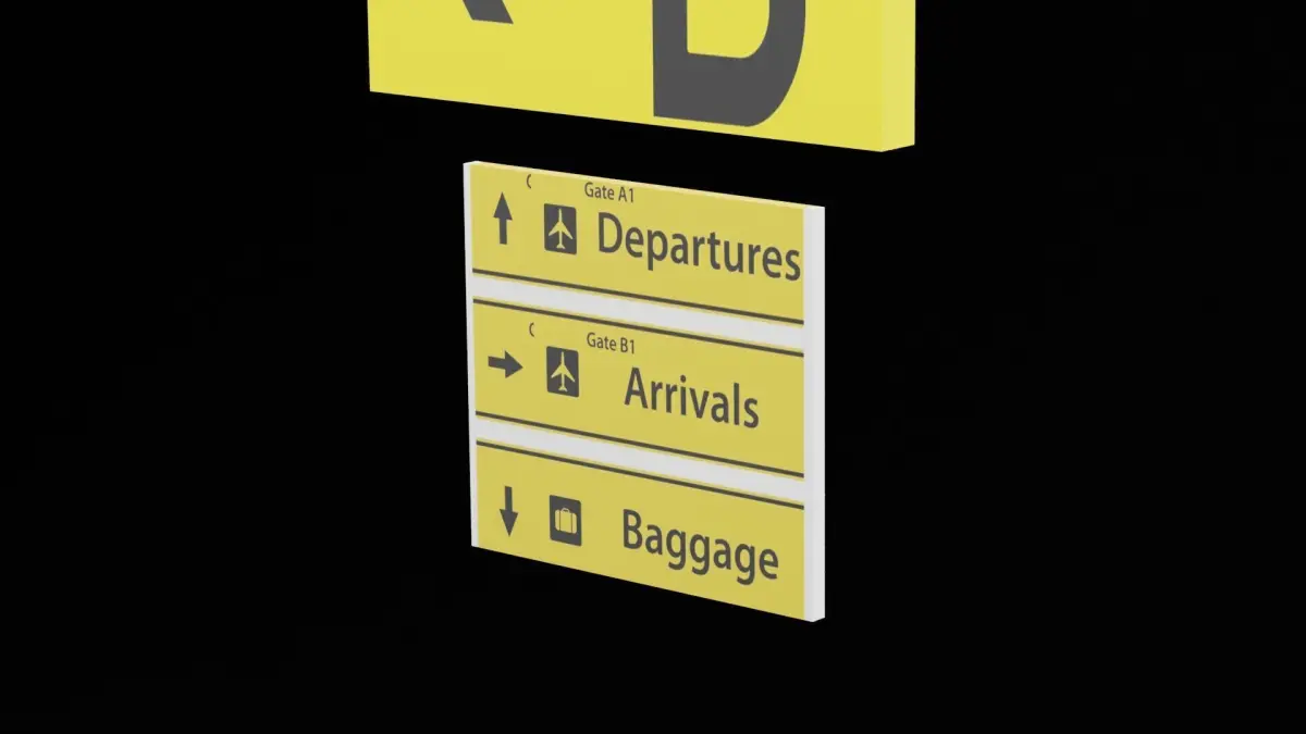 Airport Sign 3D ModelDescription: A detailed 3D model of an airport signboard designed to display information about departures, arrivals, and baggage claim. This realistic sign is built with a sleek, modern design commonly seen in international airports.