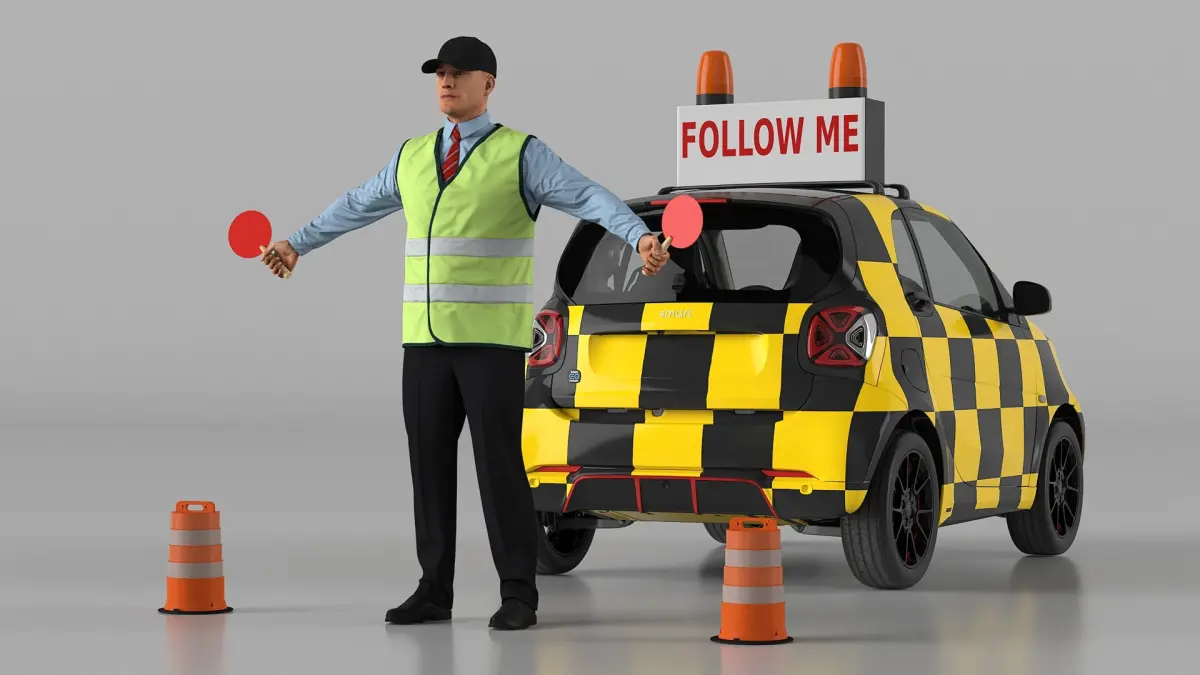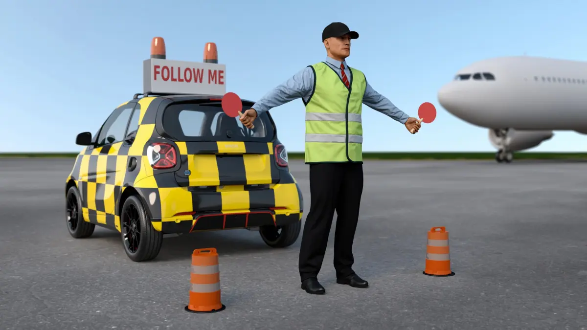 This model features a modern Follow Me car with high-visibility markings, lights, and realistic proportions, alongside accurately detailed ground crew figures equipped with reflective vests and tools. The intricate detailing ensures a lifelike depiction of airport operations and facilitates immersive use in various applications.