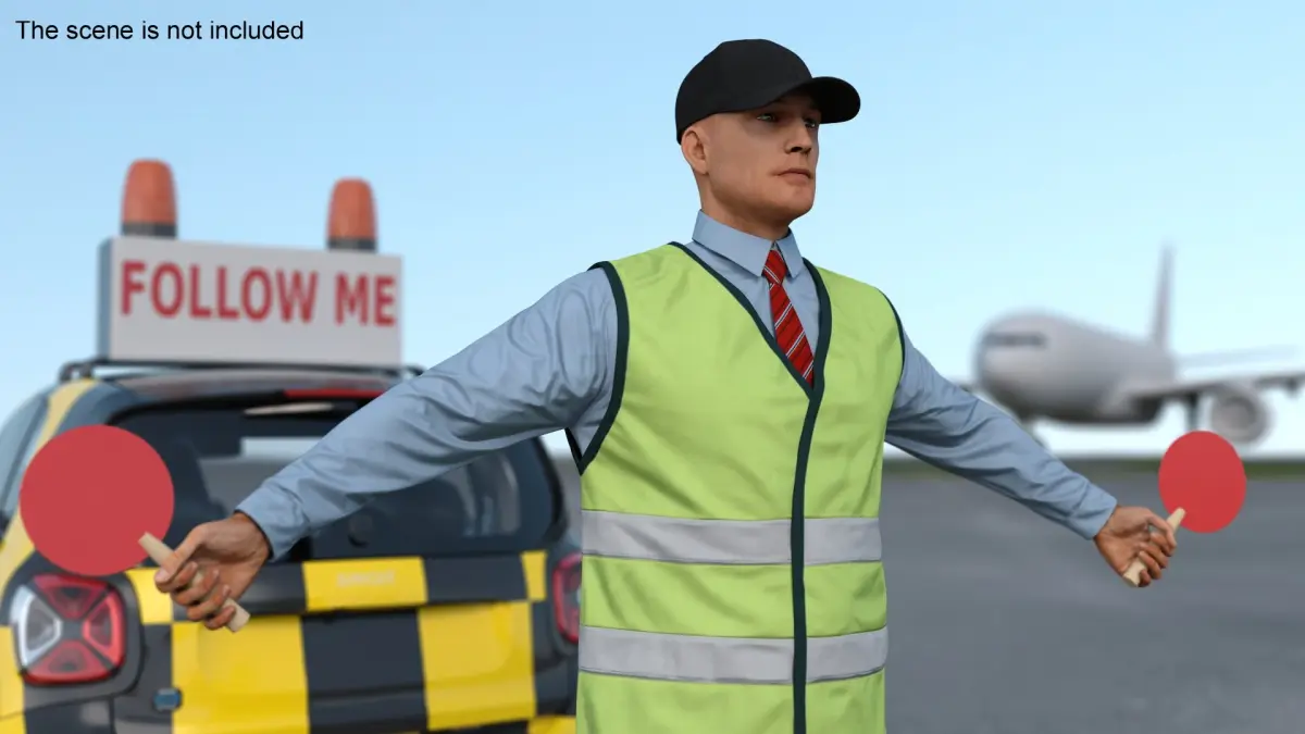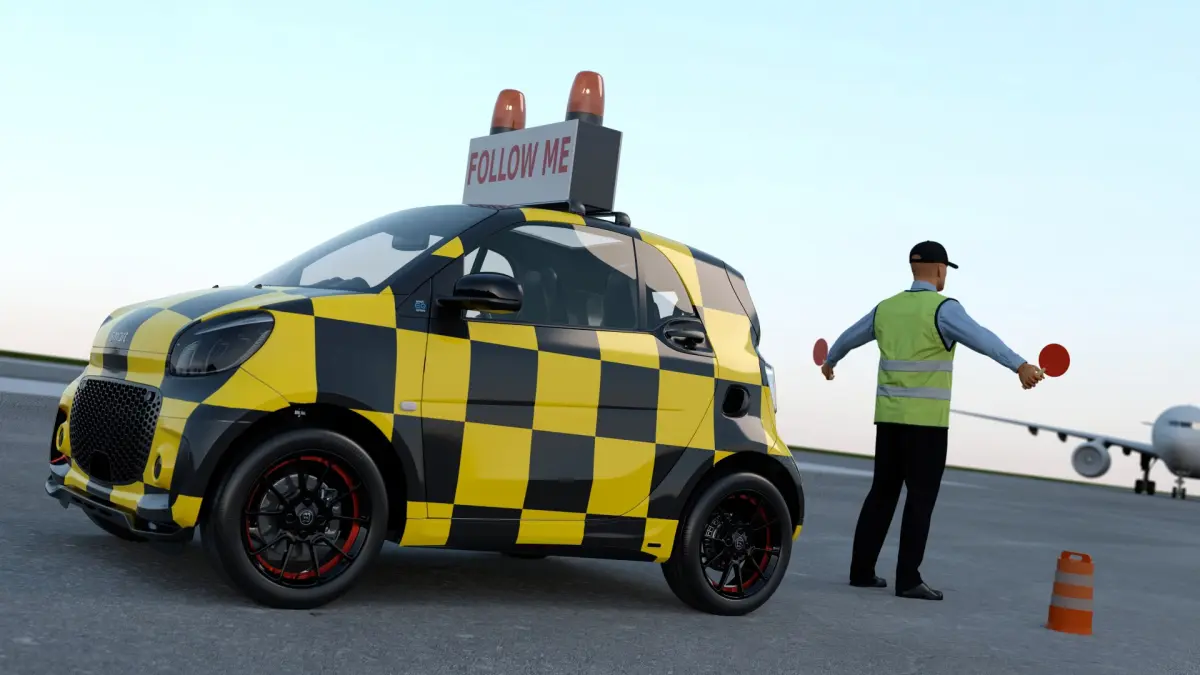 Airport Smart Follow Me Car with Ground Crew is a 3d model of an essential airport vehicle used to guide aircraft on the tarmac, accompanied by detailed ground crew personnel for an authentic representation.