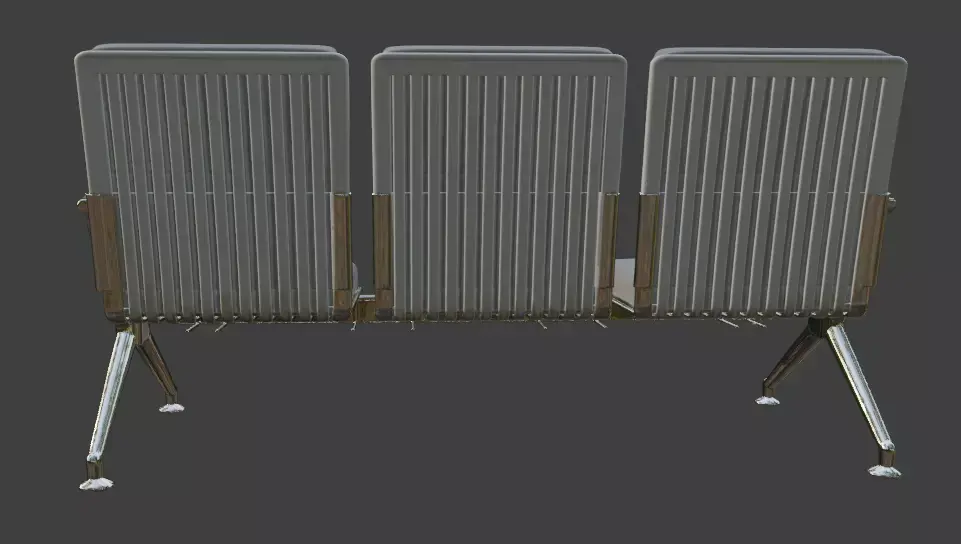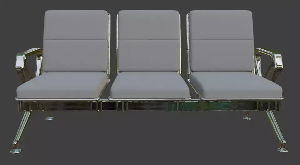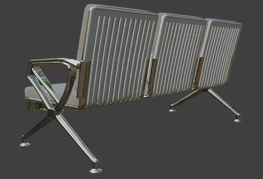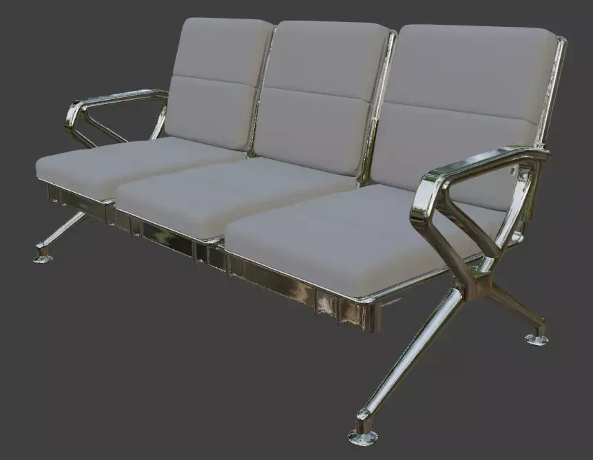 High-quality 3D model of a modern 3-seater airport waiting bench with sleek chrome metal frame and comfortable padded gray upholstery on seats and backrests. This beam-style public seating features sturdy angled legs, armrests, and realistic metallic reflections, ideal for airport terminals, hospital waiting rooms, train stations, office lobbies, clinics, and other public spaces.Perfect for architectural visualization, interior renders, game environments, VR/AR experiences, and urban scenes. The model is optimized with clean topology, UV unwrapped, and PBR materials for high realism while maintaining performance.Key Features: