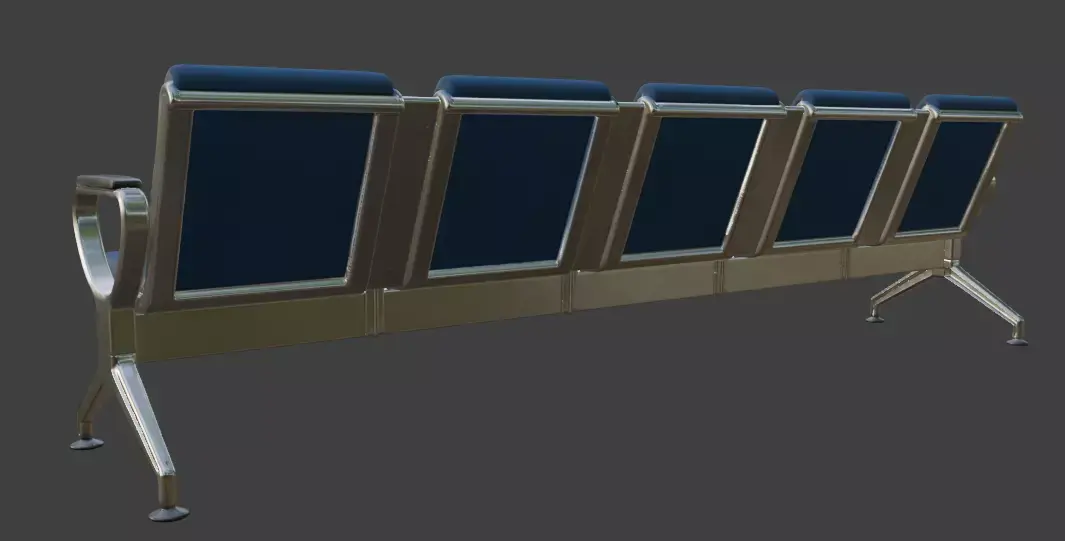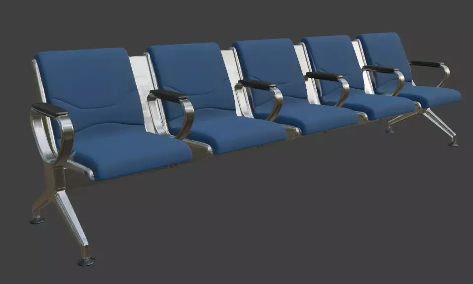High-quality 3D model of a modern 3-seater airport waiting bench with sleek chrome metal frame and comfortable padded gray upholstery on seats and backrests. This beam-style public seating features sturdy angled legs, armrests, and realistic metallic reflections, ideal for airport terminals, hospital waiting rooms, train stations, office lobbies, clinics, and other public spaces.Perfect for architectural visualization, interior renders, game environments, VR/AR experiences, and urban scenes. The model is optimized with clean topology, UV unwrapped, and PBR materials for high realism while maintaining performance.Key Features: