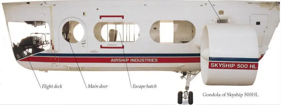 The Skyship 500 is a non-rigid airship designed and built in the United Kingdom during the 1980s.The Skyship 500 was developed from the Aerospace Developments AD500, the sole example of which was effectively the prototype / technology demonstrator for the production Skyship 500.With the formation of Airship Industries production of the Skyship 500 could commence and five further airships were produced.The Skyship 500 consists of a polyester fabric envelope, retaining helium gas, and carrying a gondola for the control cabin, passenger cabin, propulsion systems and ballast (fixed and jettison-able). The envelope is of a traditional streamlined shape with cruciform tail surfaces which carry rudder and elevator control surfaces for yaw and pitch. The undercarriage consists of a castoring twin-wheeled oleo-pneumatic strut at the rear of the gondola, with ground handling ropes for ground crew to manoeuvre the airship on the ground. The nose-cone of the envelope also carries the mooring point which can connect to a mobile mooring mast.The polyester fabric envelope is coated on the outside with Titanium Dioxide (TiO2) loaded Polyurethane to reduce Ultra-Violet degradation and lined with a Polyvinylidene chloride (PVDC) film bonded to the fabric to minimise Helium (He) losses.Most other structural components are produced from fibre-reinforced composite materials, to reduce weight, including Fibre-lam board used to build up the fibre reinforced plastic (FRP) tail surfaces and control surfaces.The moulded FRP gondola houses the control cabin, passenger cabin, power-plant systems and ballast (both fixed and jettison-able). Large windows to the front and sides provide excellent visibility for crew and passengers seated on five individual seats and a three abreast bench seat at the rear. Support for the gondola comes from Kevlar cables inside the envelope.Power for the Skyship 500 comes from two converted Porsche 930/10 engines inside the rear of the gondola driving the vectoring Hoffmann ducted reversible-pitch propellers through lateral drive-shafts and converted Westland Lynx tail-rotor gearboxes. The pilot and co-pilot seated at the front of the cabin have a full set of instruments and avionics and control the airship through yokes which operate the control surfaces though cables.One of the five production airships was modified into a heavy payload version, designated Skyship 500 (HL), using a larger Skyship 600 envelope but carrying a Skyship 500 gondola.