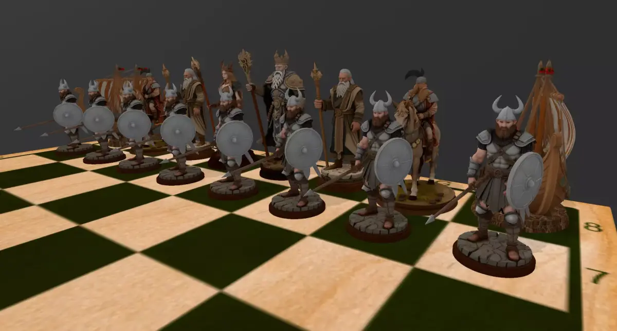 Modelo 3D para imprimir de un juego de ajedrez temático vikingo. El diseño presenta un conjunto de piezas que capturan la brutalidad y la mitología nórdica. Las figuras incluyen a reyes con cascos con cuernos, reinas con escudos, berserkers como alfiles, drakkars como torres y guerreros con hachas como peones. Es ideal para amantes de la historia, la mitología vikinga, la fantasía y para un regalo original y épico.MILES DE MODELOS STL Y GRATUITOS EN MI PERFIL !!