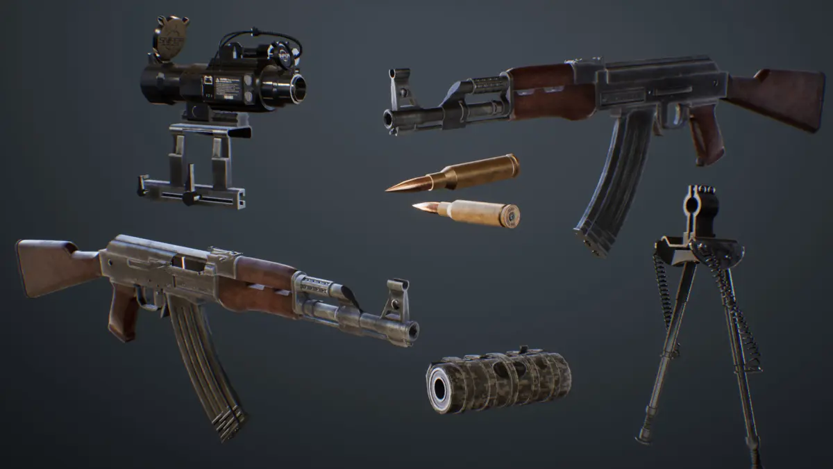 The AK-47 Assault Rifle Project is the basic version of the AK-47 model with additional parts, like bipod, suppressor and scope. Also is an optimized game ready 3d model with rigged animated parts. It contains FBX and 3dsmax files 2018-2019 versions (For older version please let me know). Previews are inside UE4 and video rendered in Marmoset Toolbag.