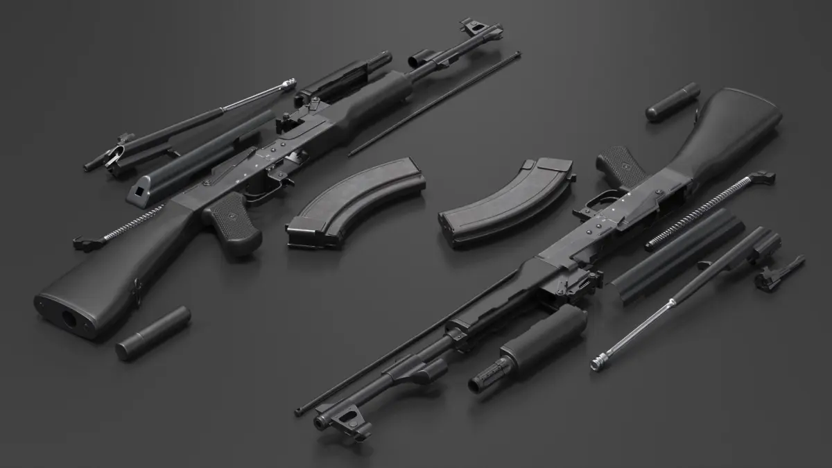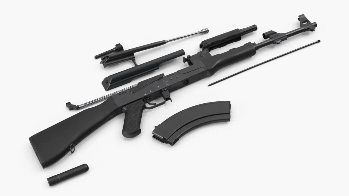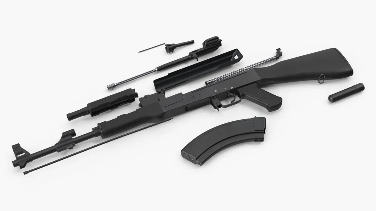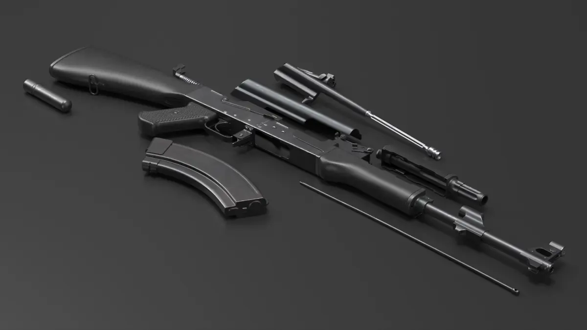 AK 47 Disassembled Black Plastic is a three-dimensional model of a disassembled assault rifle, showcasing the intricate components of this iconic firearm.