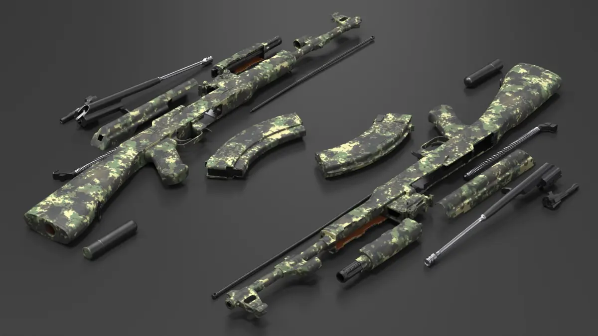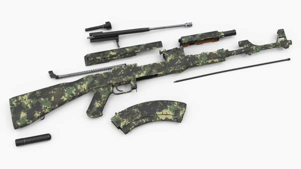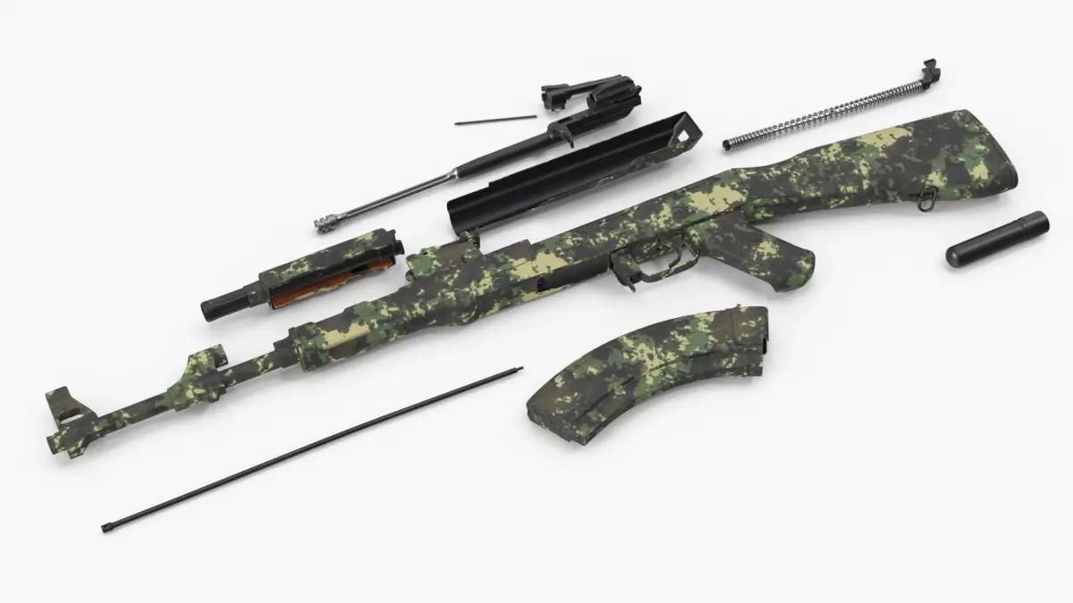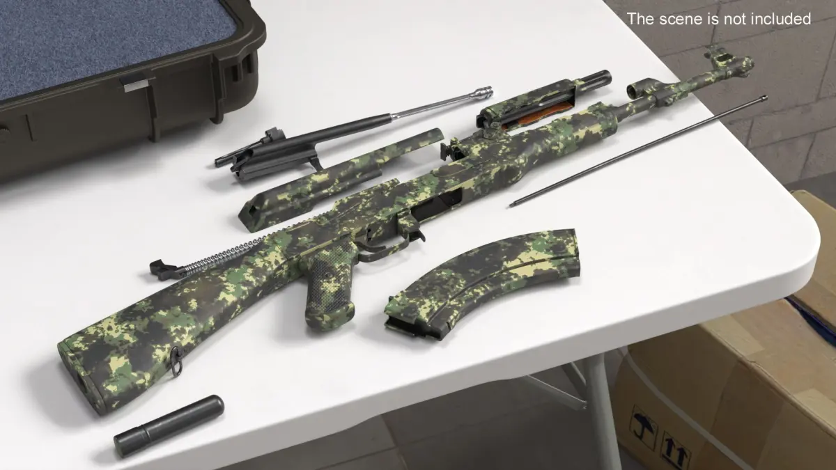 AK 47 Disassembled Camouflage is a three-dimensional model of a disassembled firearm, often referred to as a customizable assault weapon, designed for military and tactical applications.