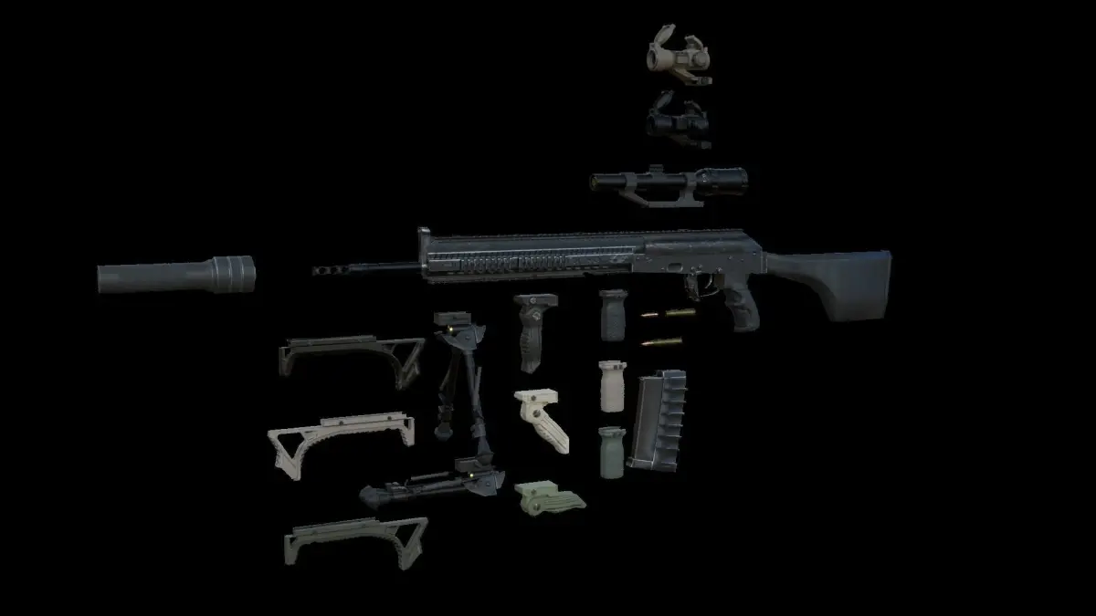 -AK DMR: 4 seperate parts for ease of animation (body, mag, bolt, selecter switch); has both 4K and 2K textures; black, tan and camoflauge; 18 409 tris; 9 588 verts.