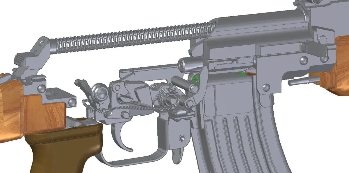 The AKM is an assault rifle chambered in 7.62×39mm Soviet intermediate cartridge. It is a selective fire, gas operated with a rotating bolt, firing in either semi-automatic or fully automatic, and has a cyclic rate of fire of around 600 rounds per minute (RPM). The gas operated action has a massive bolt carrier with a permanently attached long stroke gas piston. The gas chamber is located above the barrel. The bolt carrier rides on the two rails, formed on the side of the receiver, with a significant space between the moving and stationary parts. Despite being replaced in the late 1970s by the AK-74, the AKM is still in service in some Russian Army reserve and second-line units and several east European countries. The GRAU officially designated the AKM as the 6P1 assault rifle.