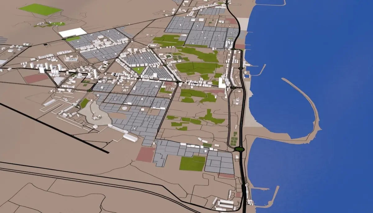 3D representation of Al Fujairah City UAE using 2019 map data. Roads, railway, land, water, buildings are made using real world data. Buildings are accurately placed and resembles the real world object up to some extend. Please note that random buildings (varying height) are added to those area where real world data is not available.