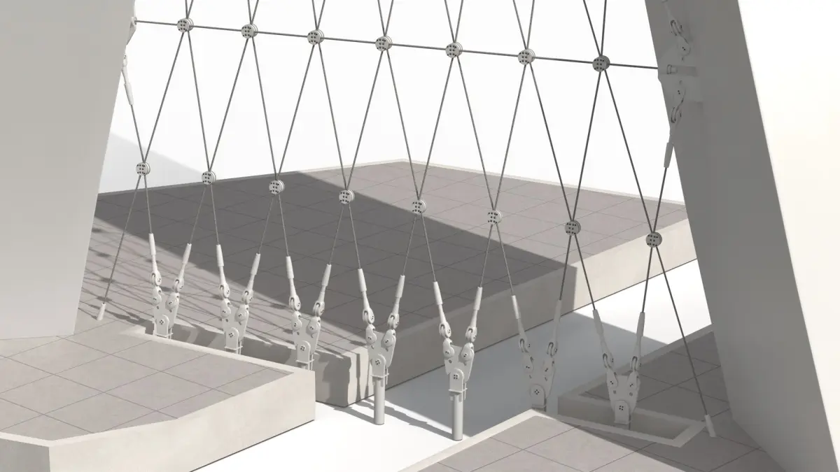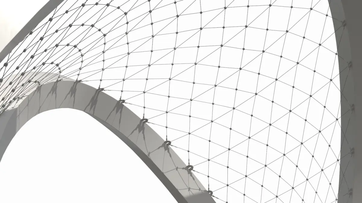 Al Wahda Arches Landmark Structure White is a 3d model of an intricate, modern architectural bridge design characterized by its sweeping arches and net-like framework.