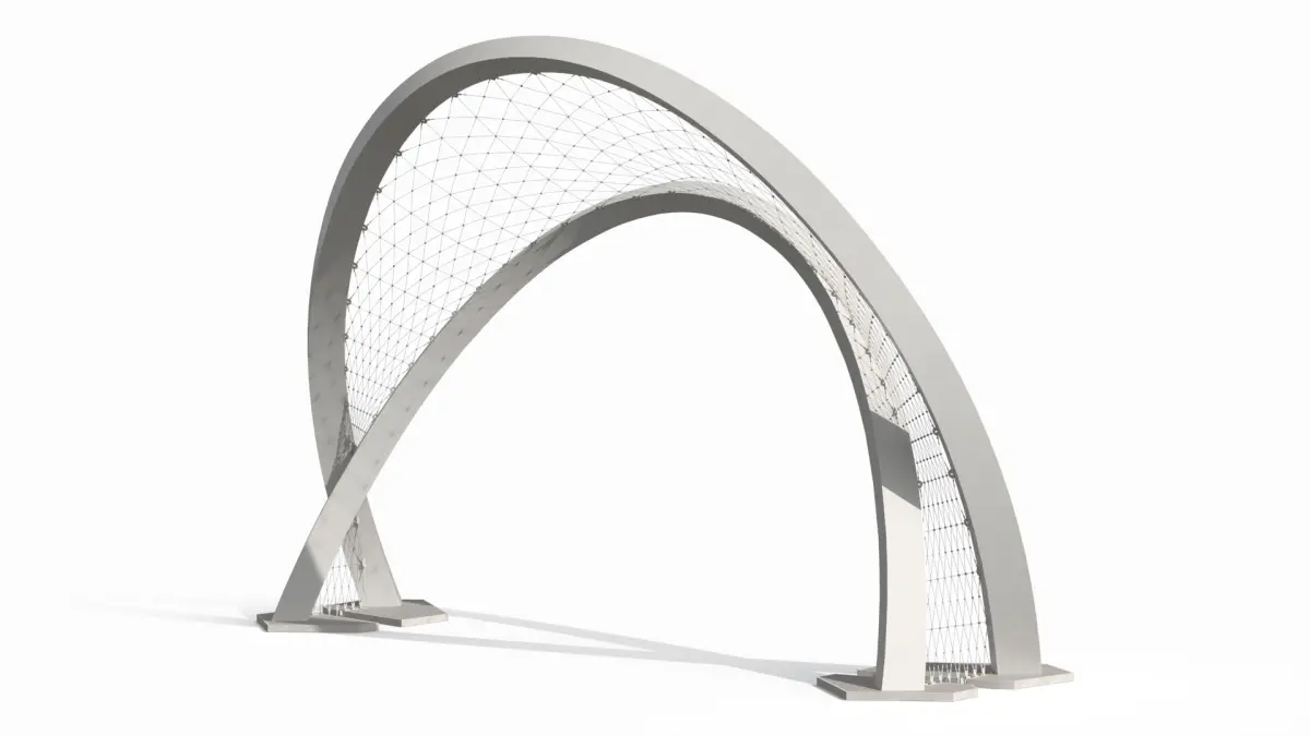 This design showcases a minimalist aesthetic with two large intersecting arches made of sleek materials, creating a dynamic visual. The netting between the arches suggests a blend of engineering prowess and artistic vision, allowing for both functional use and decorative appeal.