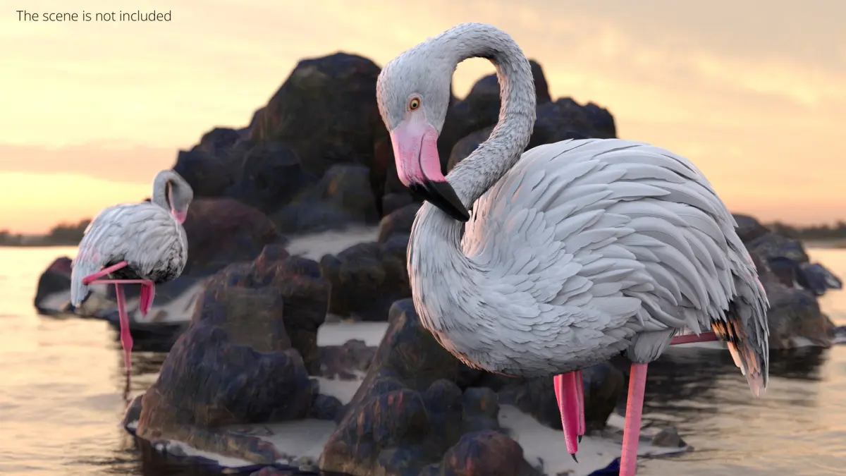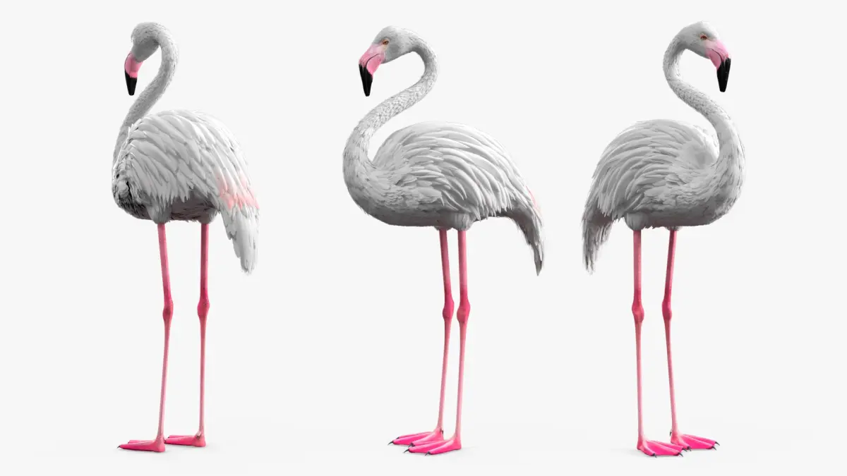 Albino Flamingo Bird White Rigged for Maya is a three-dimensional model of large wading bird, that is a distinctive species recognized for its pink plumage and long legs.