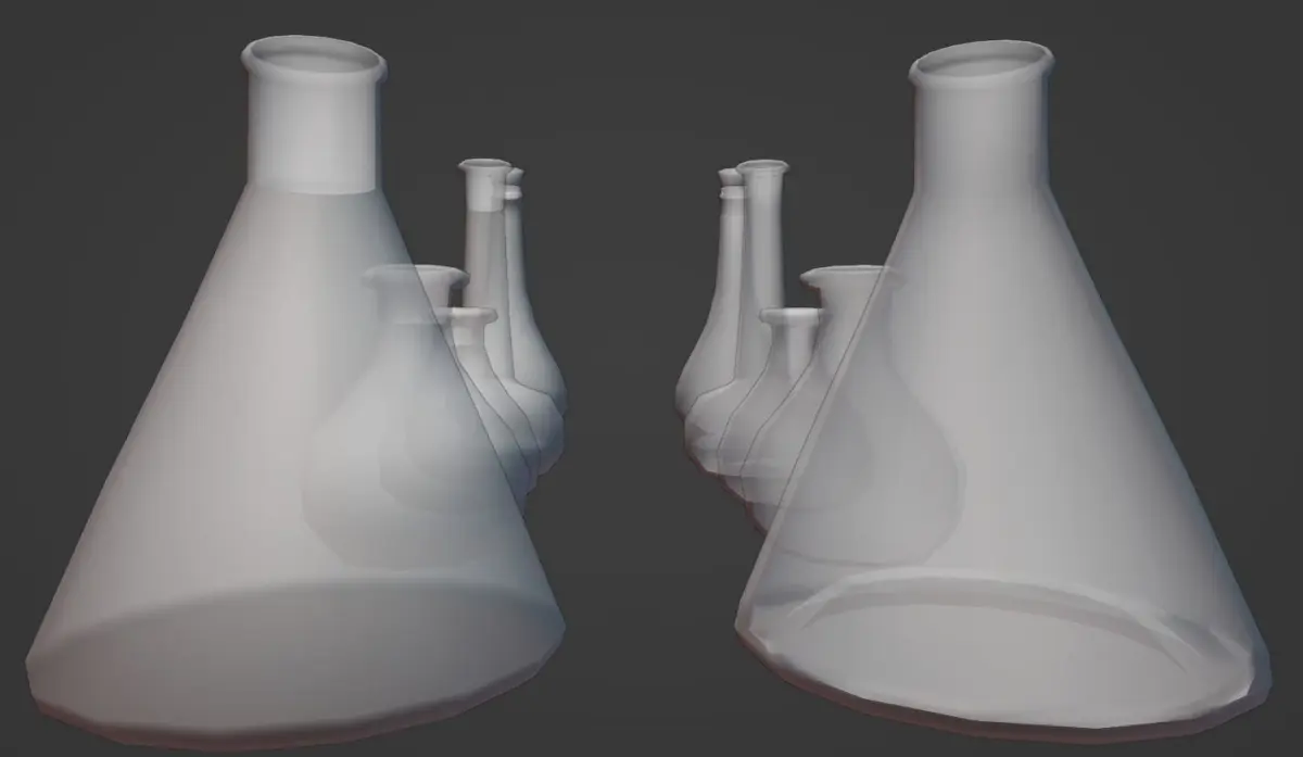 Each beaker occupies its own uv space, single beakers have 2 sets of UVs (in the FBX format) 1 which overlaps the double beaker UVs to streamline texturing (at the expense of wasted map space), the other UVs are stetched to better fill the map. See example in Cone UVs preview where the single overlapping is highlighted in orange.
