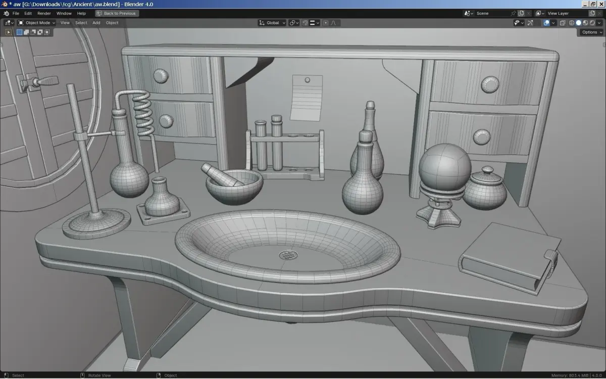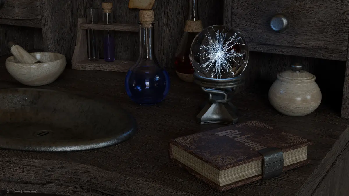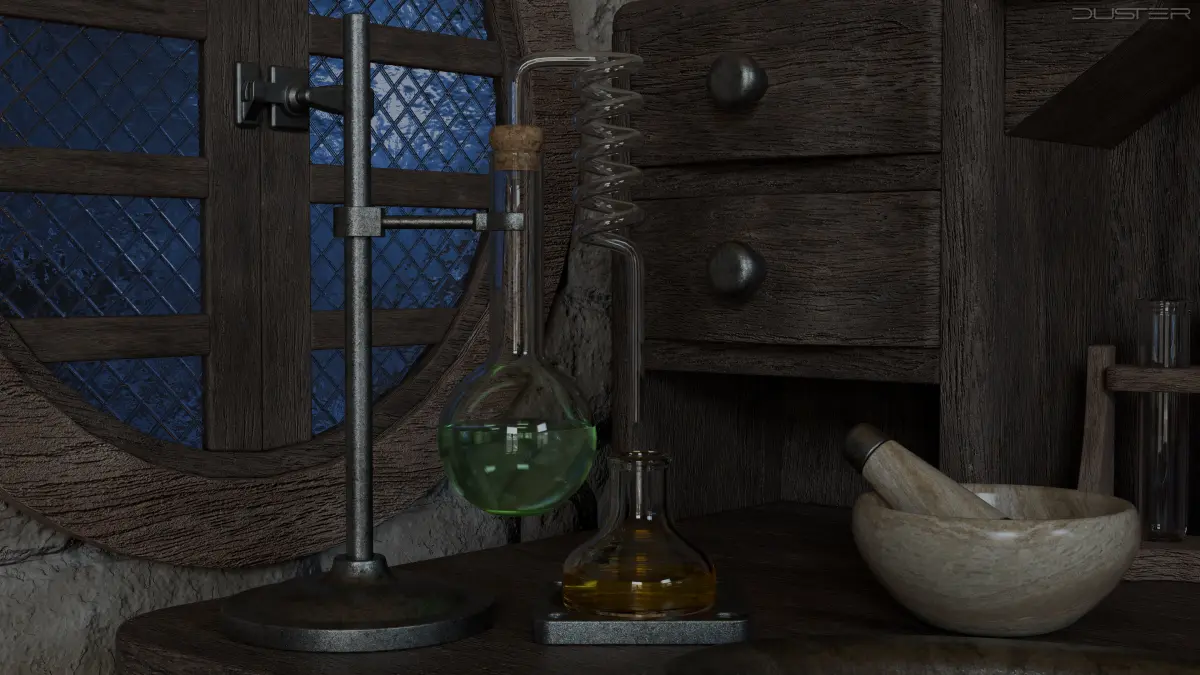 A set of 3D models including an alchemy table, some alchemical glassware, a book, mortar & pestle etc. The table is located in a small room corner with window.Created and textured in Blender, boolean/n-gon workflow, the models were successfully tested in Unity (as FBX).