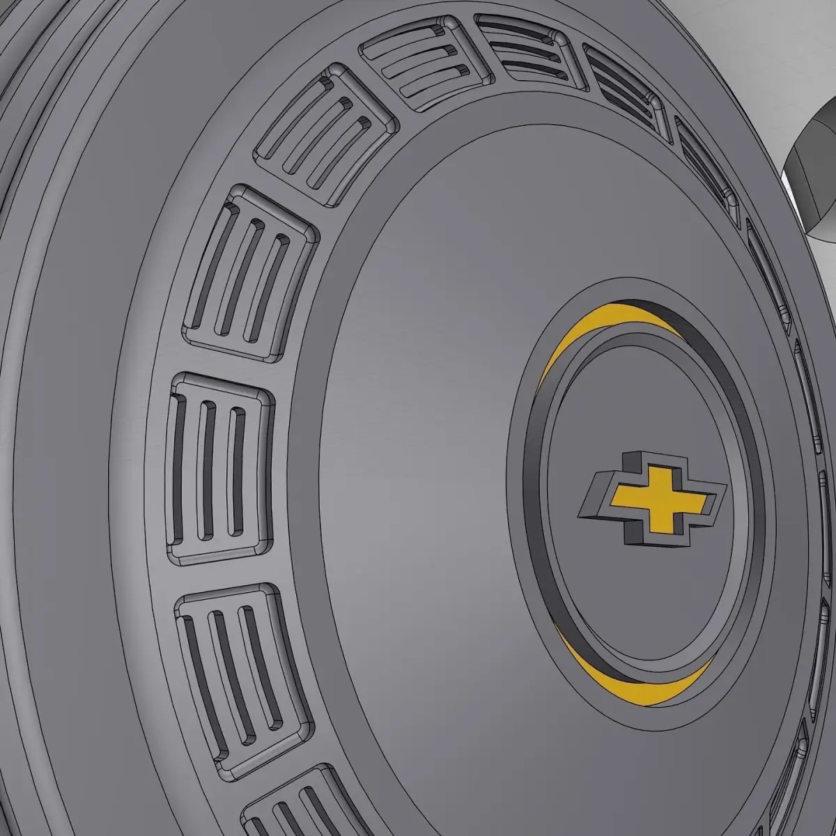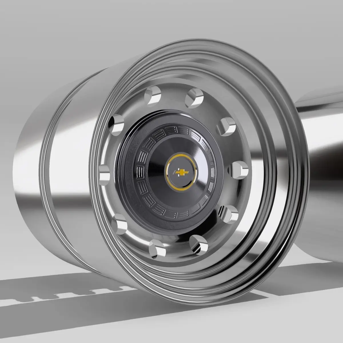 Designed from scratch is a set of reversable Alcoa wheel centres with a seperate hoop, and a detailed Chevy hubcap, high in detail, ideal for scale modeling (currently in 1/24 and 1/25 scale).