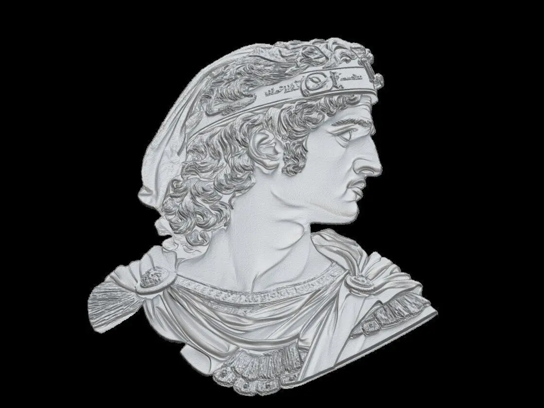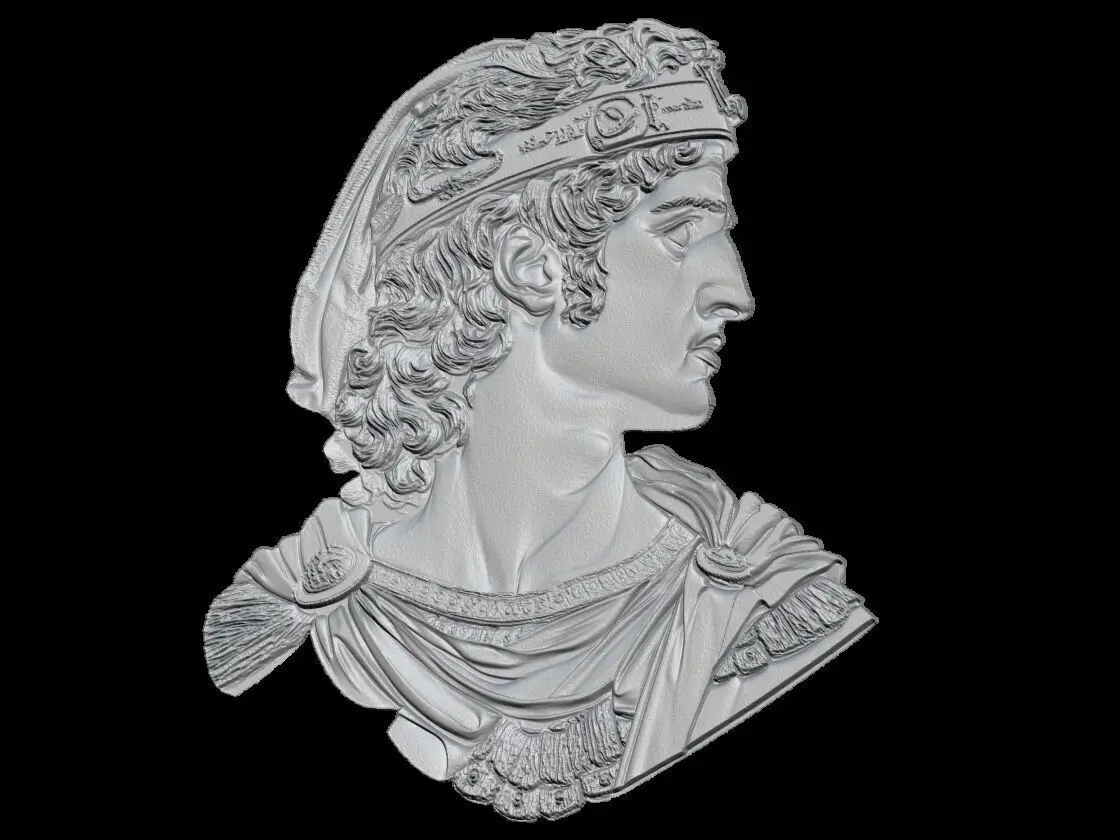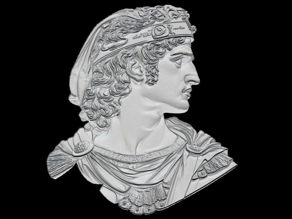 This exquisite 3D relief model depicts Alexander the Great in stunning classical style. The sculpture features meticulous detailing with perfectly rendered curled hair, royal diadem with inscriptions, and traditional Hellenistic military attire including draped fabric and decorative shoulder armor. The profile view captures the noble features and commanding expression of this legendary Macedonian king and conqueror. Dimensions are 20 cm length, 20 cm width, and 3 cm thickness. This high-quality model is ideal for historical art collections, educational displays, interior design, or classical-themed decor. Perfect for 3D printing, CNC carving, or digital applications, this ready-to-use model requires no additional processing and brings the timeless legacy of one of history's greatest military leaders to any setting.