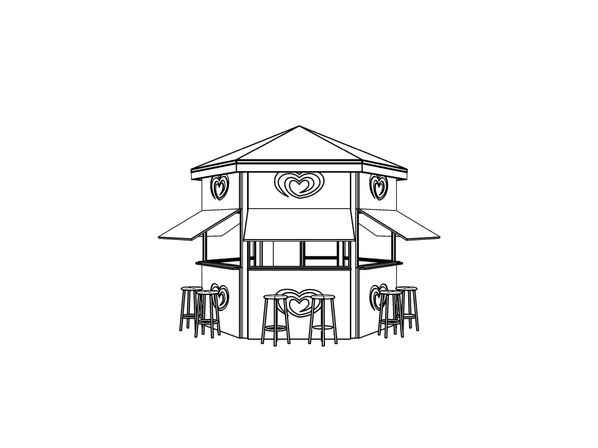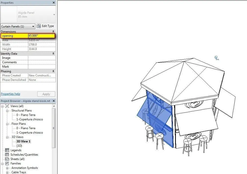 Hexagonal stand / kiosk 3D model of the Typical Algida wooden gazebo. Panels opening angle can be changed individually, plus there's the Algida logo on the Curtain PanelsNative Revit 2015 version (and later).