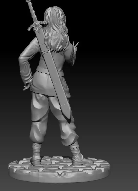 She is a standard character: a girl with a sword and a funny pose. She can be used either as a female character or even as a child, since you can print her without the sword.