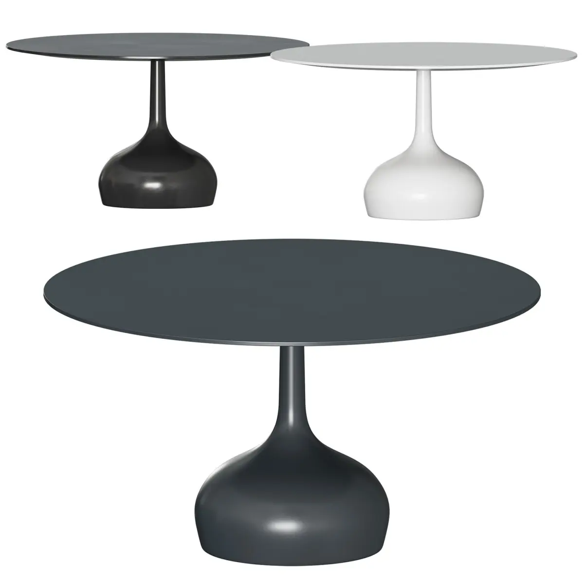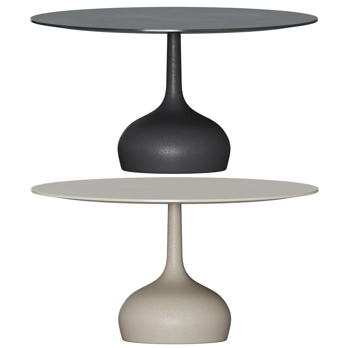 The SAEN is an inverted bowl that rests most of its weight directly on the floor, eliminating the need for a low center of gravity. The base is made of compact rigid polyurethane, a high performance material with advanced technical and aesthetic properties. Technopolymer, in fact, creates a perfectly clean and even surface while maintaining the concrete silhouette of the original project. The textured paint stem is supported by variously shaped MDF or varnished wood countertops in various finishes.Conceived as a dining table for the modern home or for contract use, the saen is available with a round table top with a diameter of 140, 160 or 180 cm.Lightness and heaviness merge in a striking stylistic oxymoron thanks to the results of technological research that allows Alias to create objects that reveal a sculptural soul