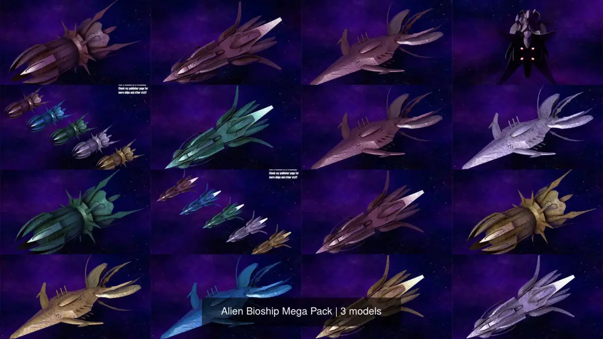 This mega pack contains 3 scifi spaceship models. All models have 5 different texture sets. All ships are available for single purchase too.