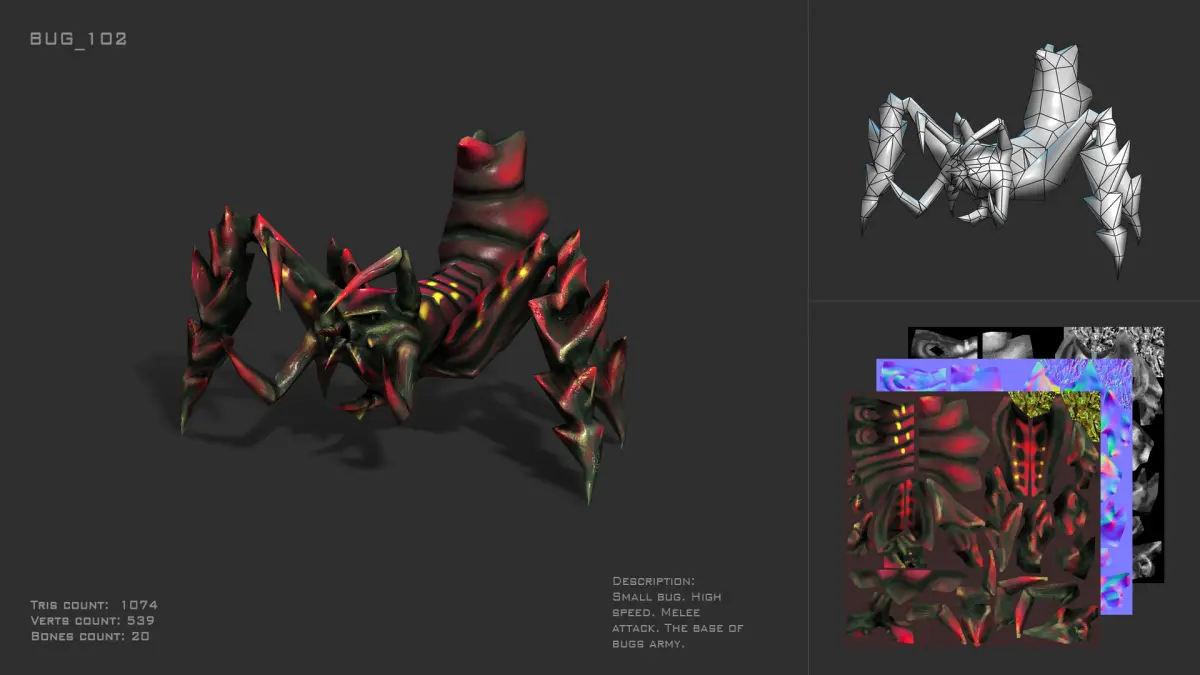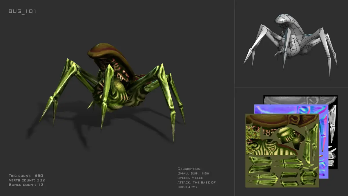 All bugs come with duffuse, specular and normal maps 1024x1024.