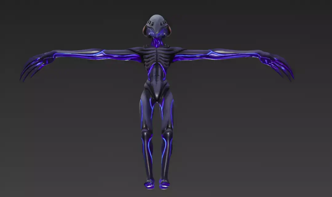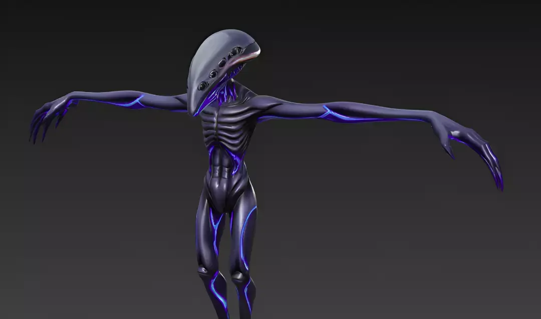 Realistic 3D of a slender alien creature in T-pose, elongated limbs with bioluminescent veins glowing blue, smooth gray exoskeleton, and multiple eyes on a elongated head. With high-resolution textures, subtle iridescent sheen, and soft volumetric lighting.