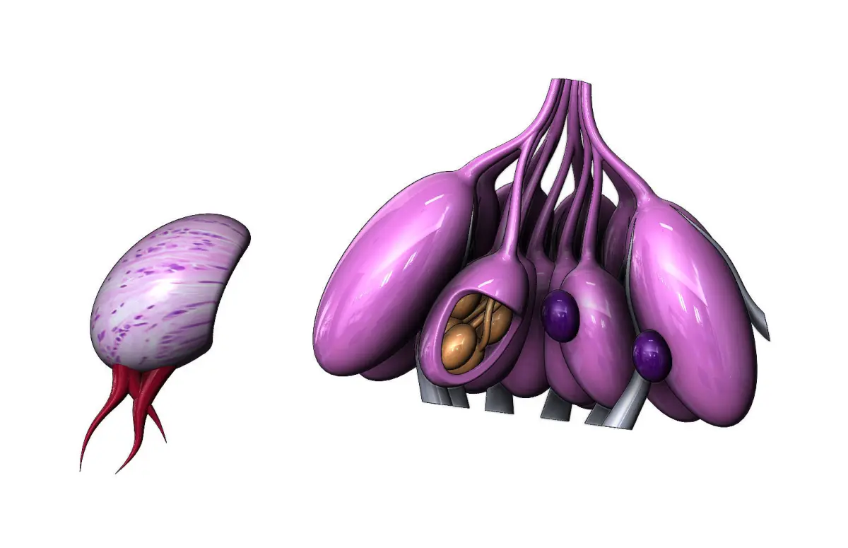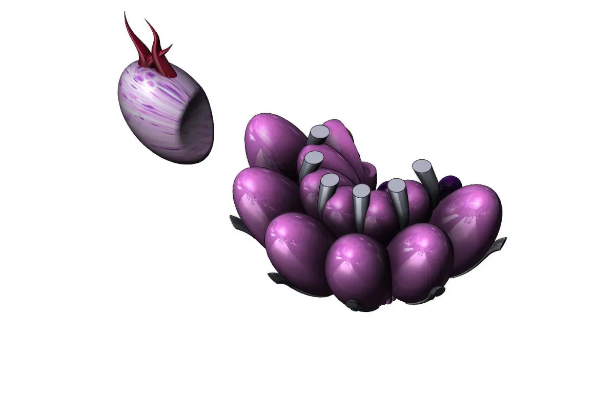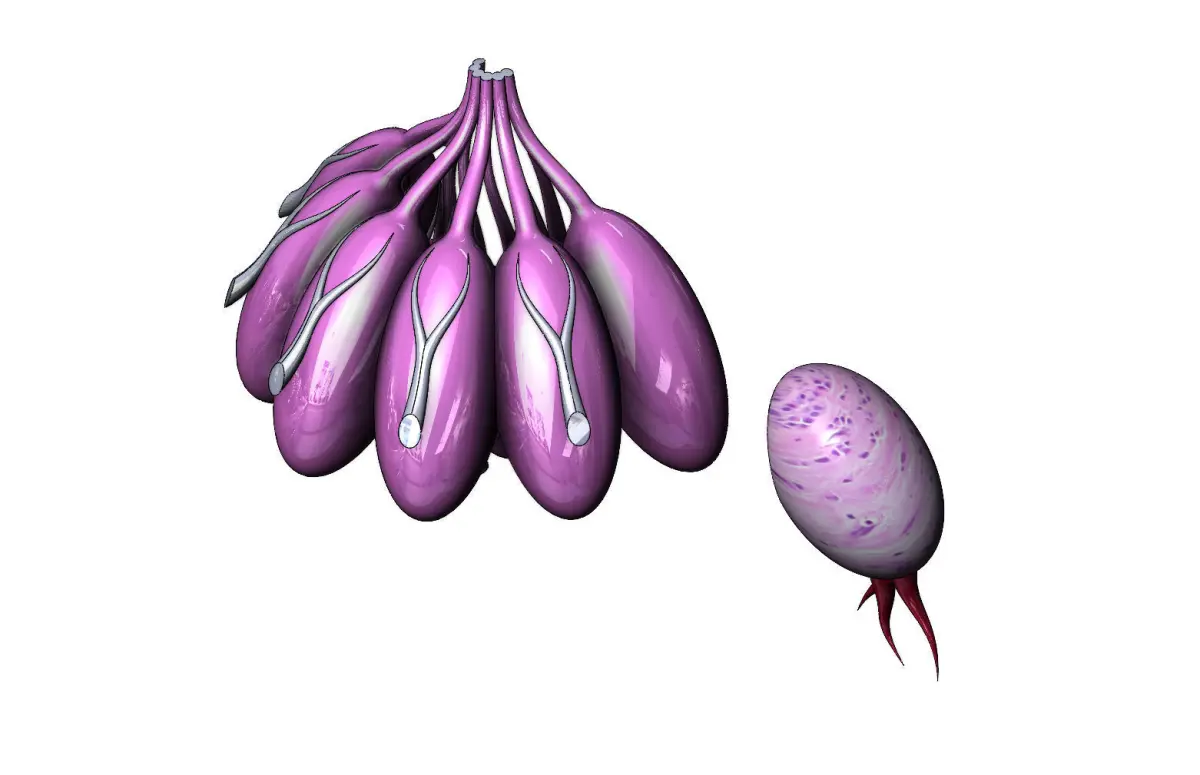 Alien shapes and egg clusters inspired by the anatomy of a human female breast, lobules and ligaments.