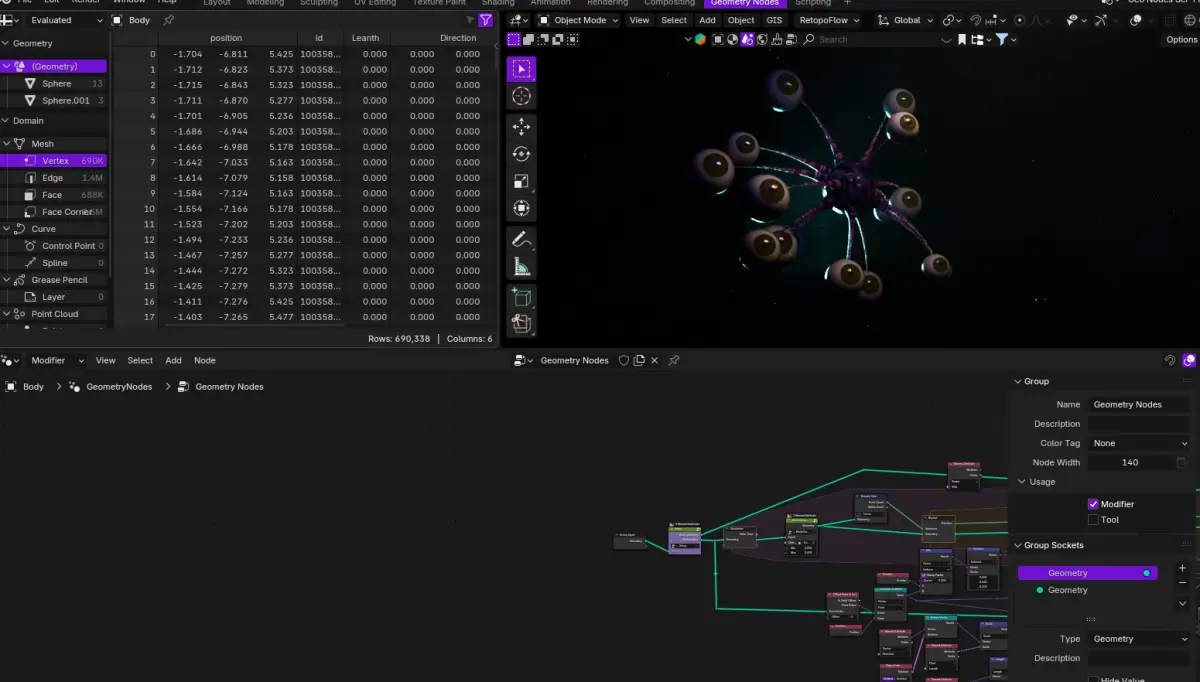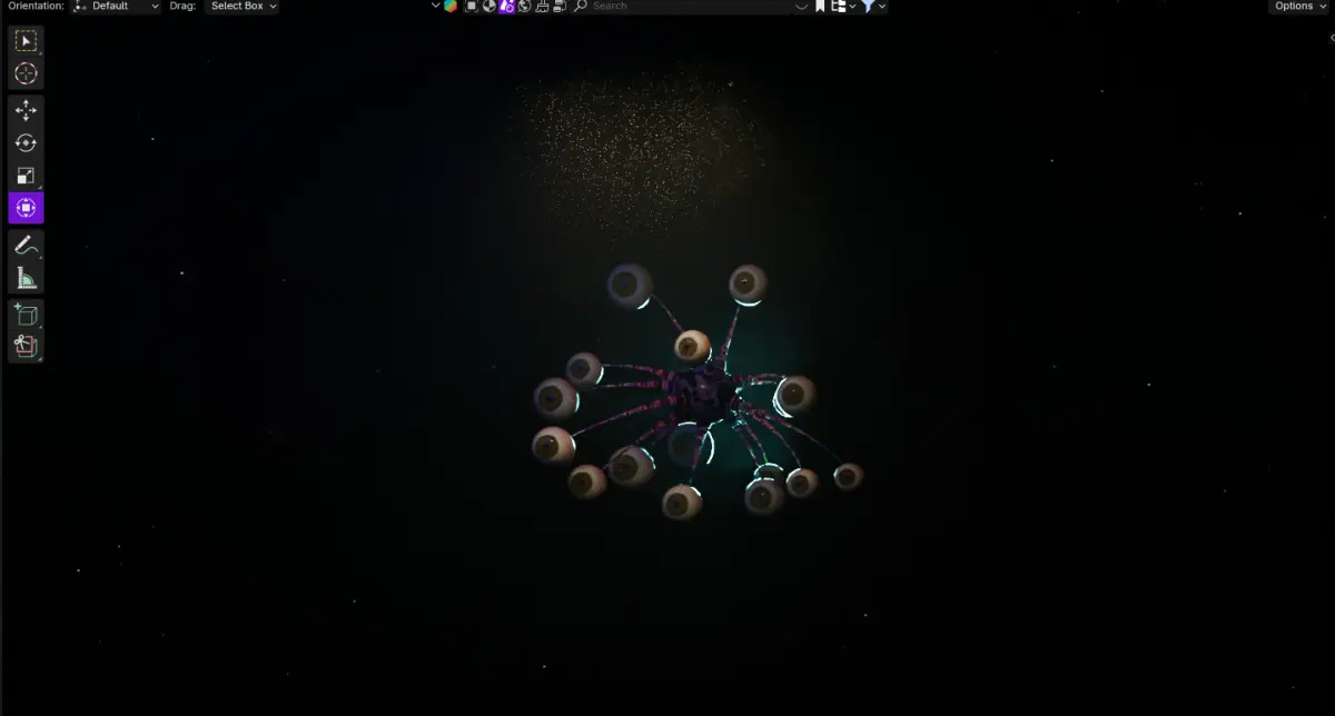 This eerie and surreal alien creature was meticulously crafted in Blender. Featuring a central body with multiple tentacle-like appendages, each ending in a glowing eyeball, this design exudes an unsettling yet fascinating extraterrestrial presence. The dark, space-like background enhances the mysterious aura, making it a perfect addition to sci-fi and fantasy collections. The model showcases impressive 3D modeling and texturing skills, ideal for use in games, animations, and concept art.
