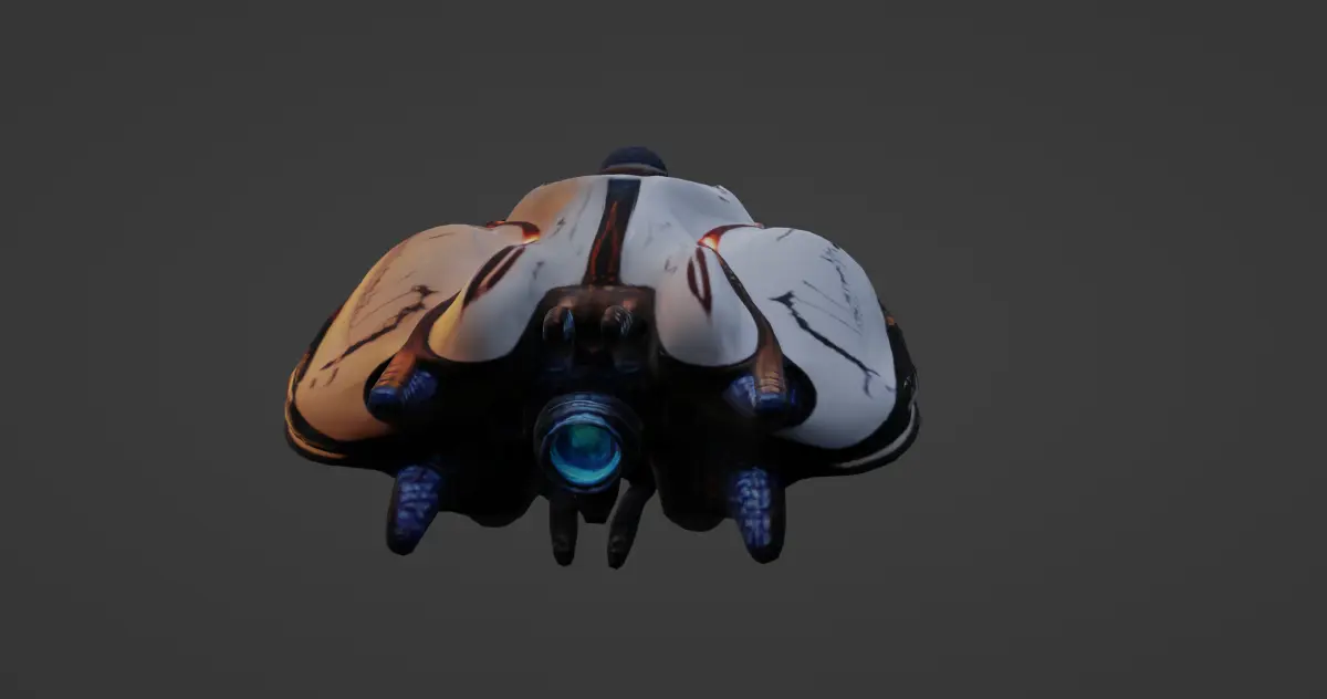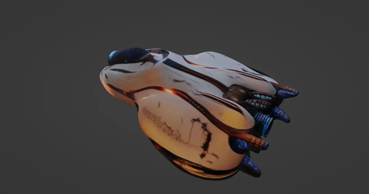 The model features a carefully crafted cockpit area with layered metallic textures and glowing control interfaces, providing an authentic sci-fi appearance. The surface is adorned with subtle wear and tear effects, adding realism and history to the spaceship’s design. Its organic yet mechanical form ensures it stands out, making it ideal for use in video games, movies, or animations requiring a sophisticated and alien-like spacecraft.