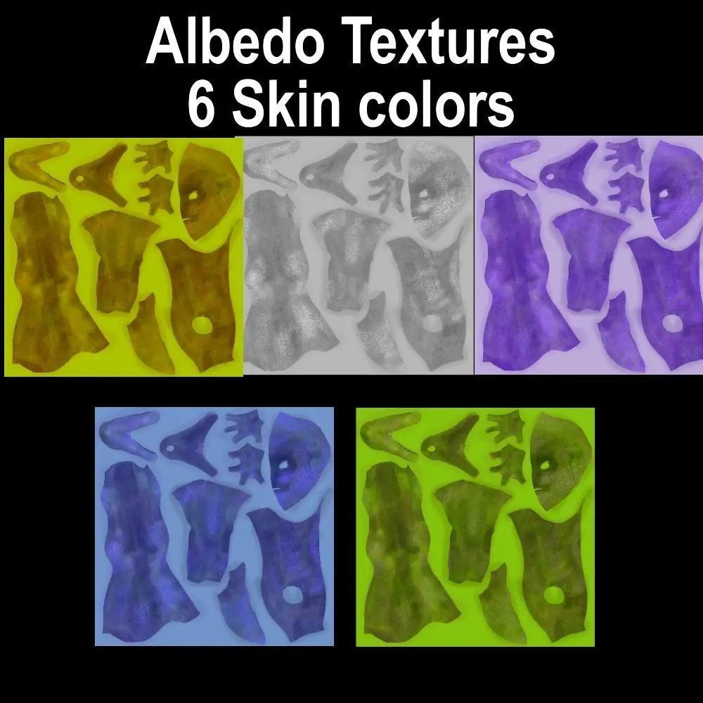 The 3D model has the necessary textures to make a realistic skin, the textures are:-AlbedoTextures (Green, Yellow, Purple, Blue, White)-AoMap (Ambient Oclussion)-BumpMap-NormalMap-SpecularMap-Roughness MapThe textures are in 4k definition.You can use the texture like you want to create the skin material, in the Blender file the material is alredy.