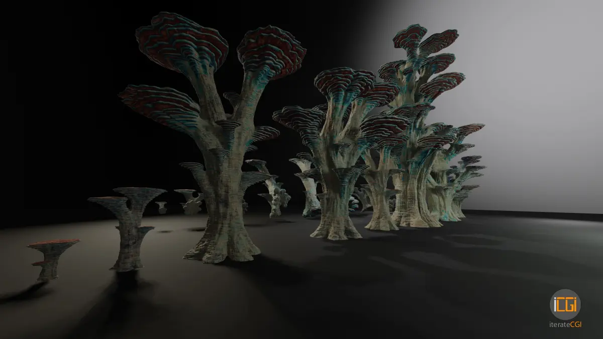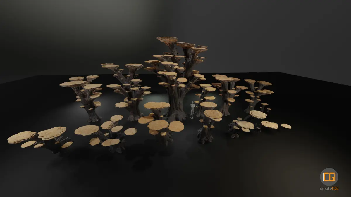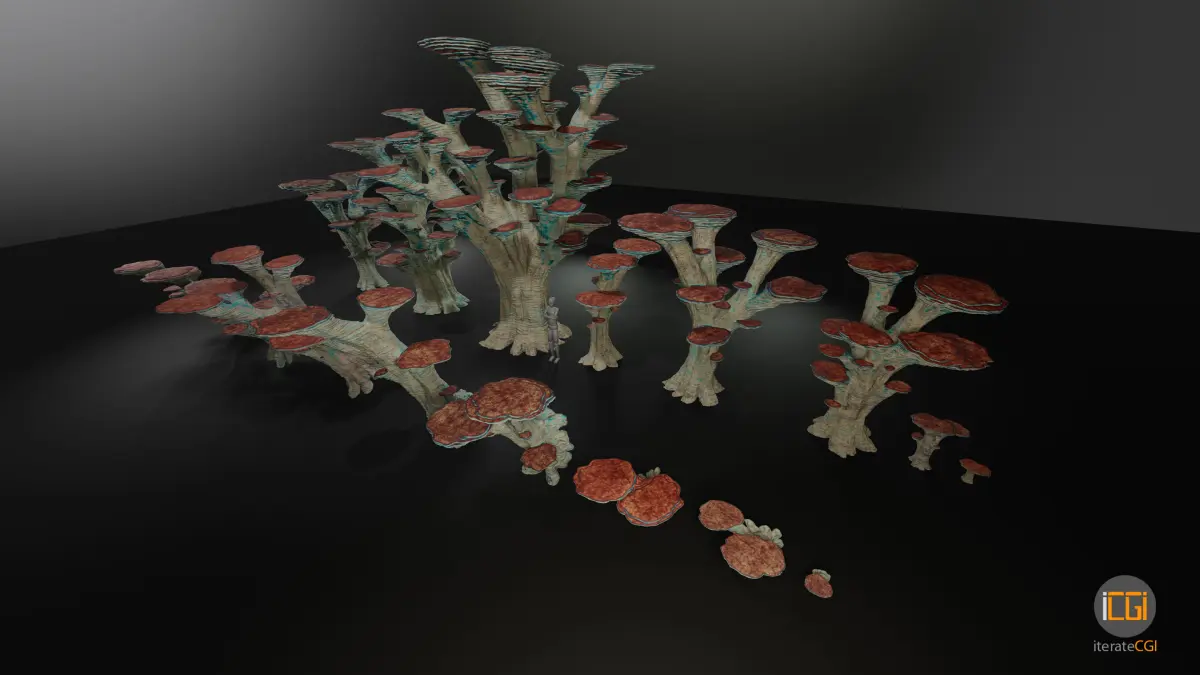 Alien plant pack mushroom type 3 contains 16 variations ranging from smaller to larger samples, 8 variations for flat terrain and 8 variations for various degrees of sloped terrain. Included are 10 color variations for each model. Everything is consistently named and structured for maximum ease of use.