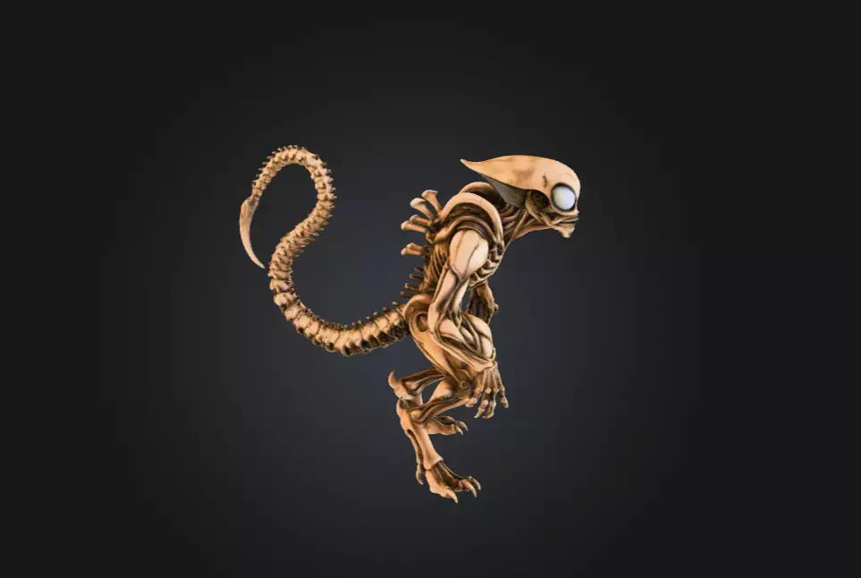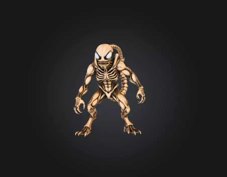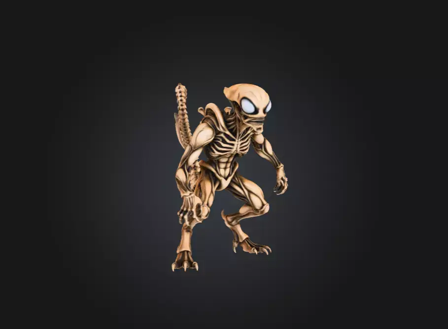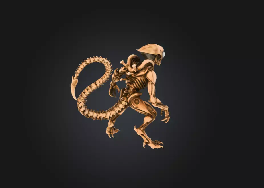 The being’s elongated limbs and clawed hands are designed for traversal across both terrestrial and alien landscapes, whether climbing sheer surfaces, leaping impossible distances, or grappling prey with a grip that no creature can easily escape. The most striking feature, however, is its segmented tail—long, whip-like, and tipped with a hardened bone spike. This tail acts as both weapon and sensory extension, capable of piercing armor, striking with blinding speed, or balancing the creature during agile maneuvers.