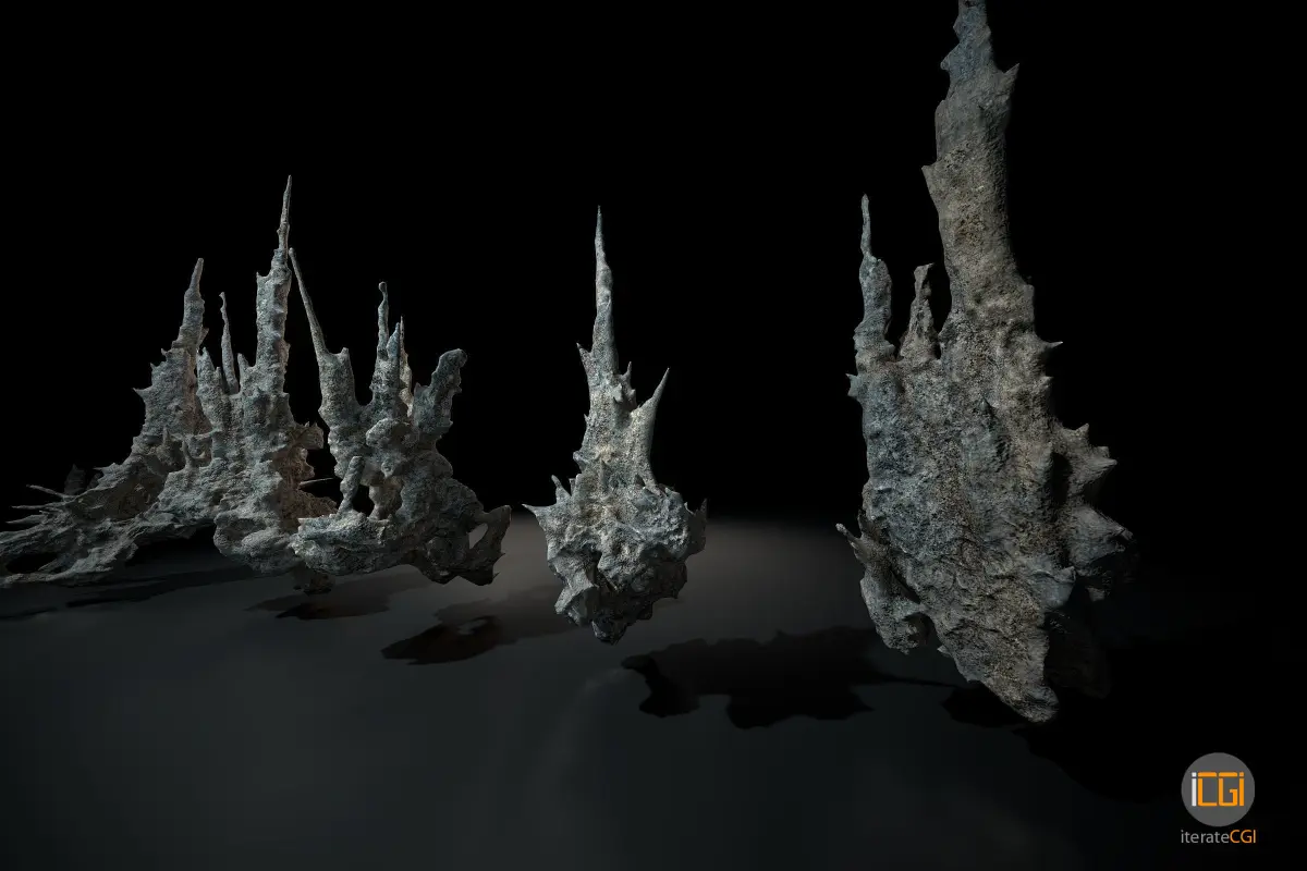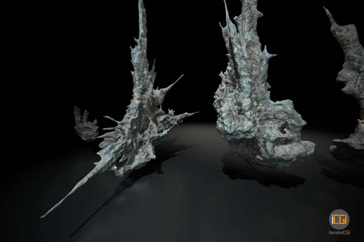 Alien spiky lava rocks, a set of 6 stylized 3D rock formations and 12 different PBR shaders, ideal for mediterranean, volcanic, desert or alien landscaping/environment designing (suitable for offline rendering or real-time rendering). This is a one texture fits all solution, meaning the texture islands of each separate model are fit in one UV template so all models share one big 4K texture/shader.