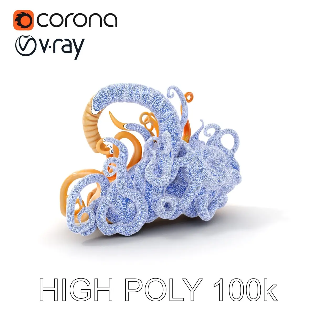 This model pack features a highly detailed alien tentacled creature suitable for various applications. Each model includes three levels of detail: low-poly for mobile (1000 triangles), middle-poly for environments (10,000 triangles), and high-poly for production rendering (100,000 triangles).