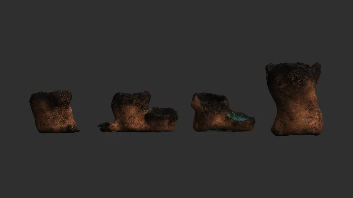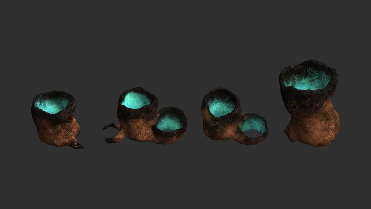 Four alien tubes, all sharing the same 2K texture in .png format. Textures have Diffuse, Specular, Height, and Normal maps. The models are low-poly, game-ready, watertight, and can be subdivided. Available formats are 3ds .obj .fbx .blend, and .dae. Previews were rendered in Anim8or. Blender was used for file conversion.