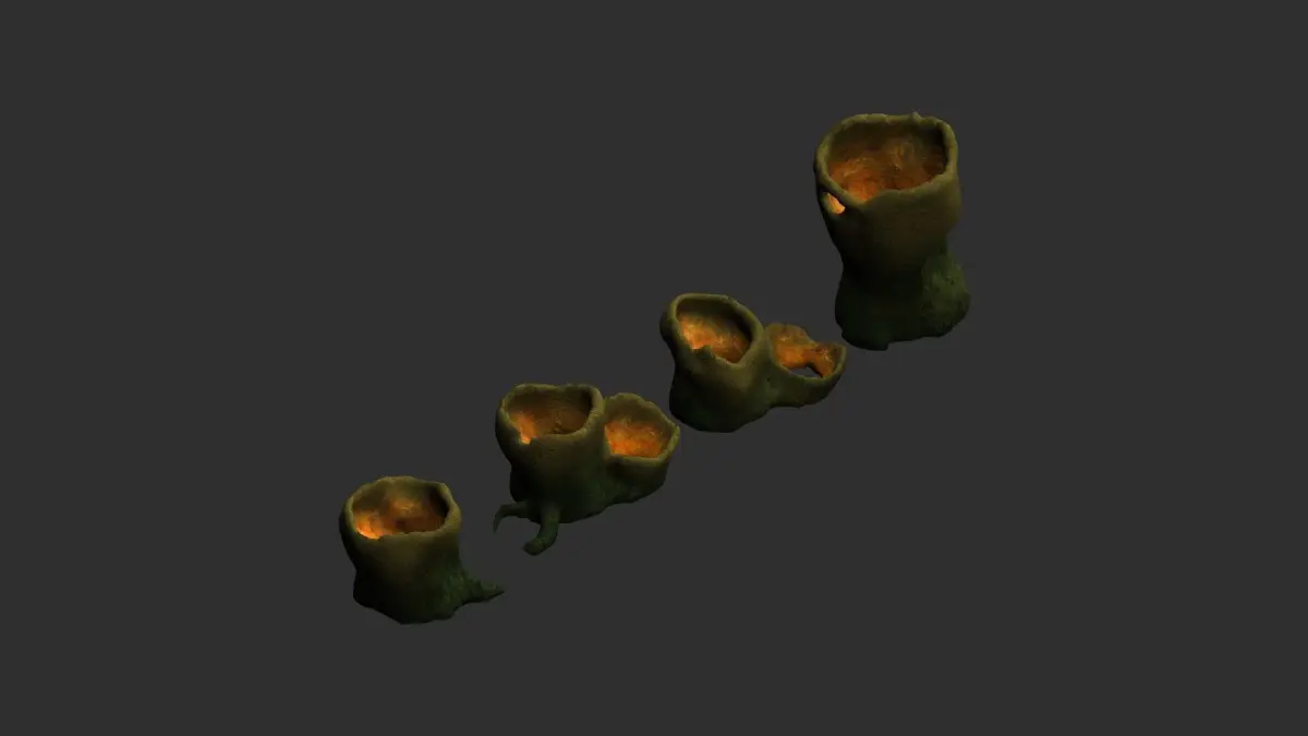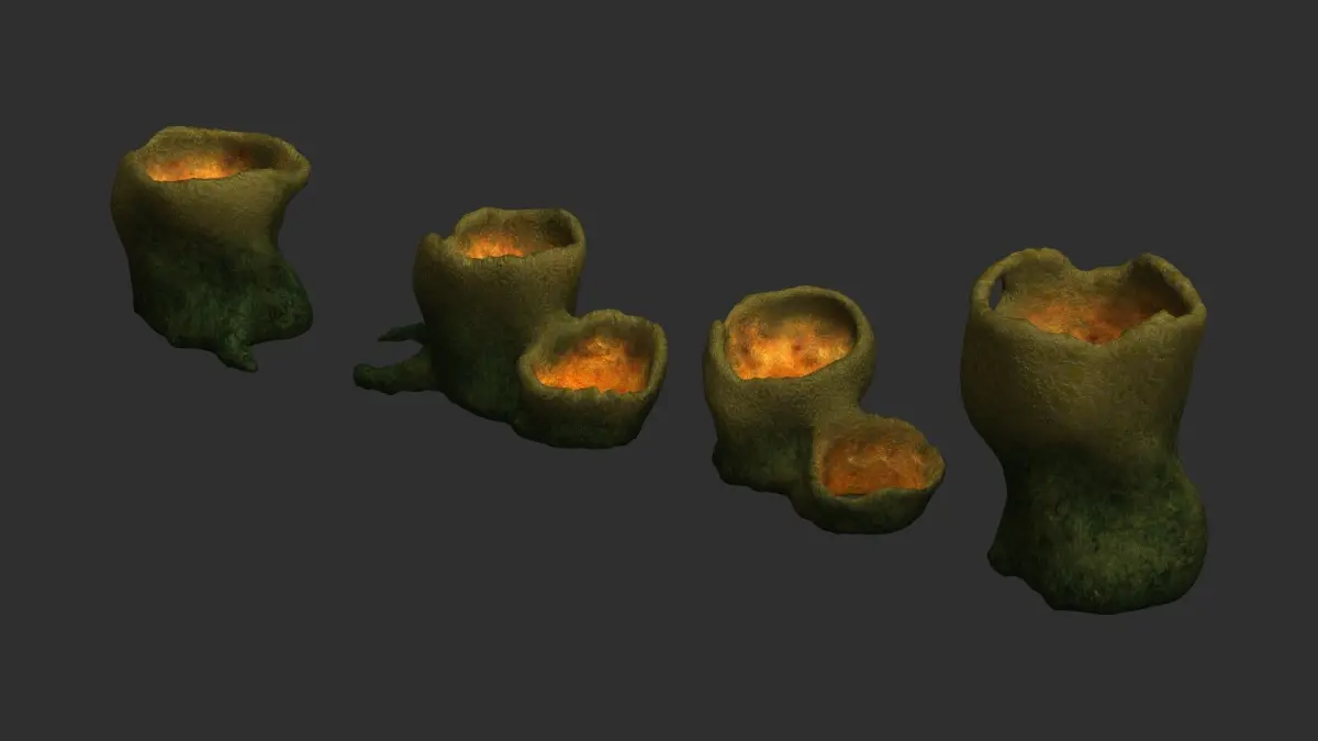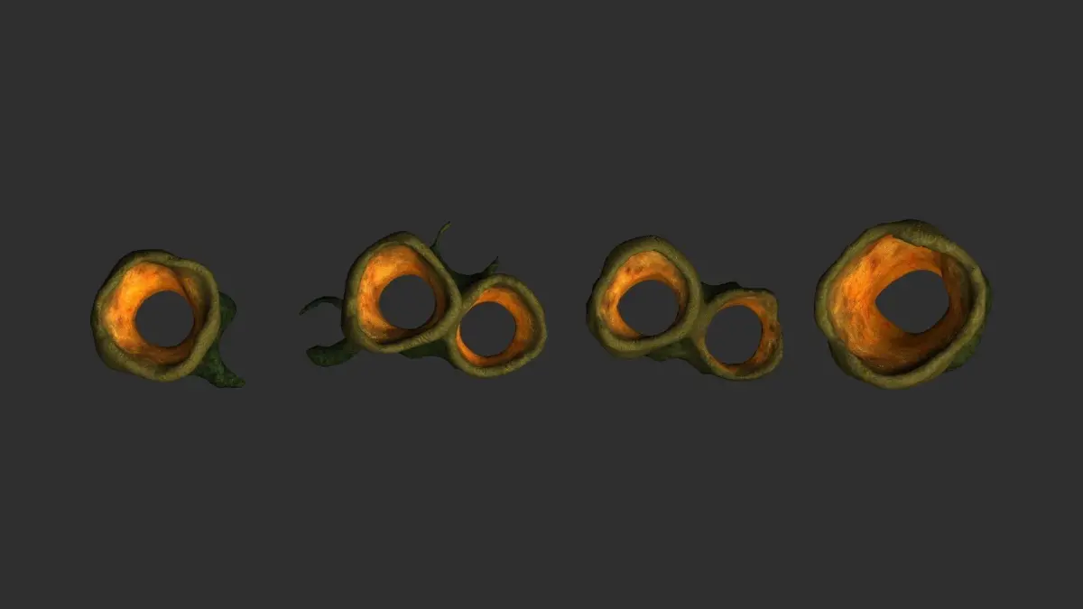 Four alien tubes, all sharing the same 2K texture in .png format. Textures have Diffuse, Specular, Height, and Normal maps. The models are low-poly, game-ready, watertight, and can be subdivided. Available formats are 3ds .obj .fbx .blend, and .dae. Previews were rendered in Anim8or. Blender was used for file conversion.