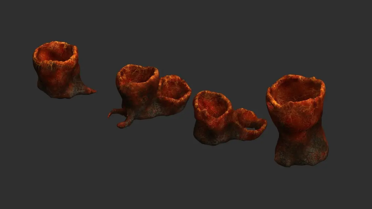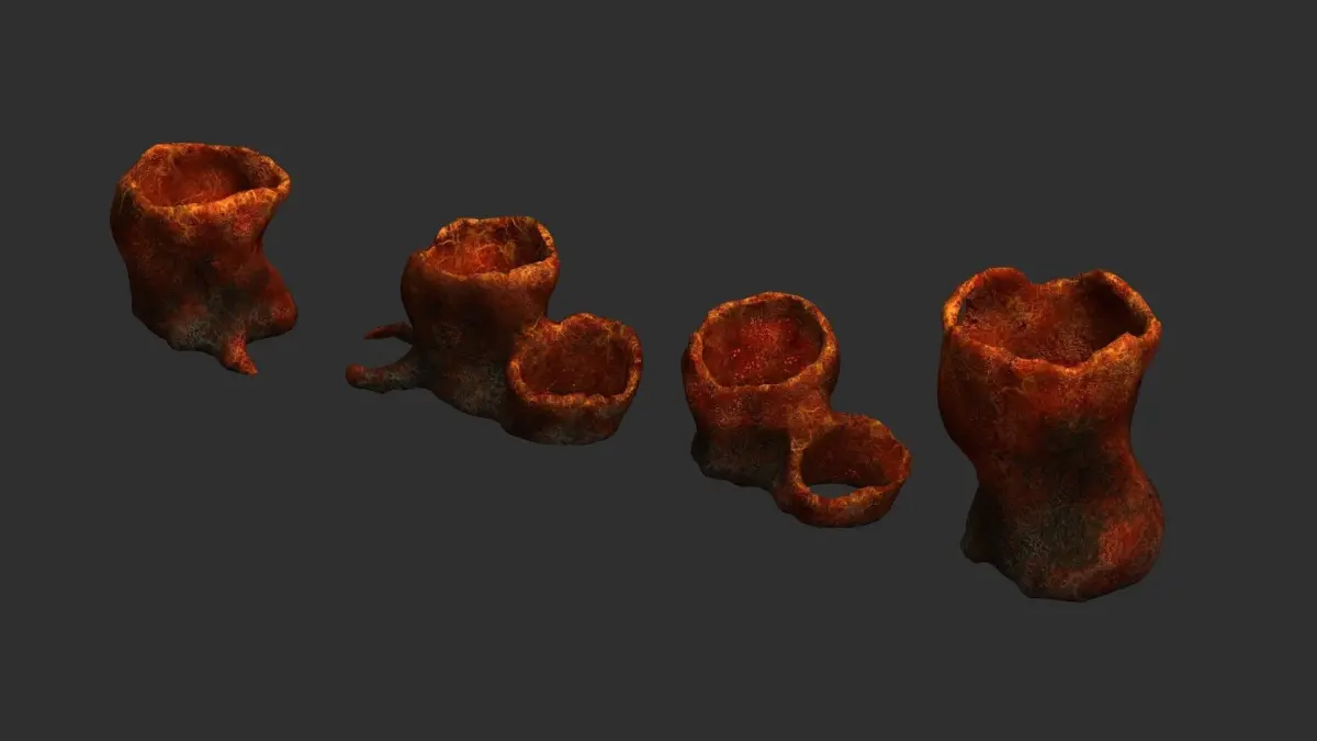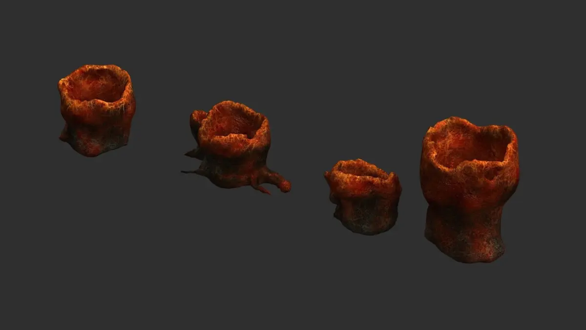 Four alien tubes, all sharing the same 2K texture in .png format. Textures have Diffuse, Specular, Height, and Normal maps. The models are low-poly, game-ready, watertight, and can be subdivided. Available formats are 3ds .obj .fbx .blend, and .dae. Previews were rendered in Anim8or. Blender was used for file conversion.