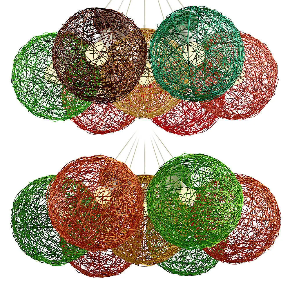 The file contains luminaires of three diameters. Installed as a single hanger or 7 pieces on one base. In total, there are 6 lamp models and 10 color options for them in the scene. For the convenience of assigning a color to each individual suspension, I divided them into groups. In addition, in the scene, each color is assigned to a separate sphere in an additional group, for the convenience of assigning material to rattan.