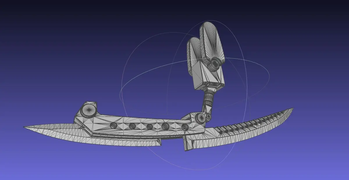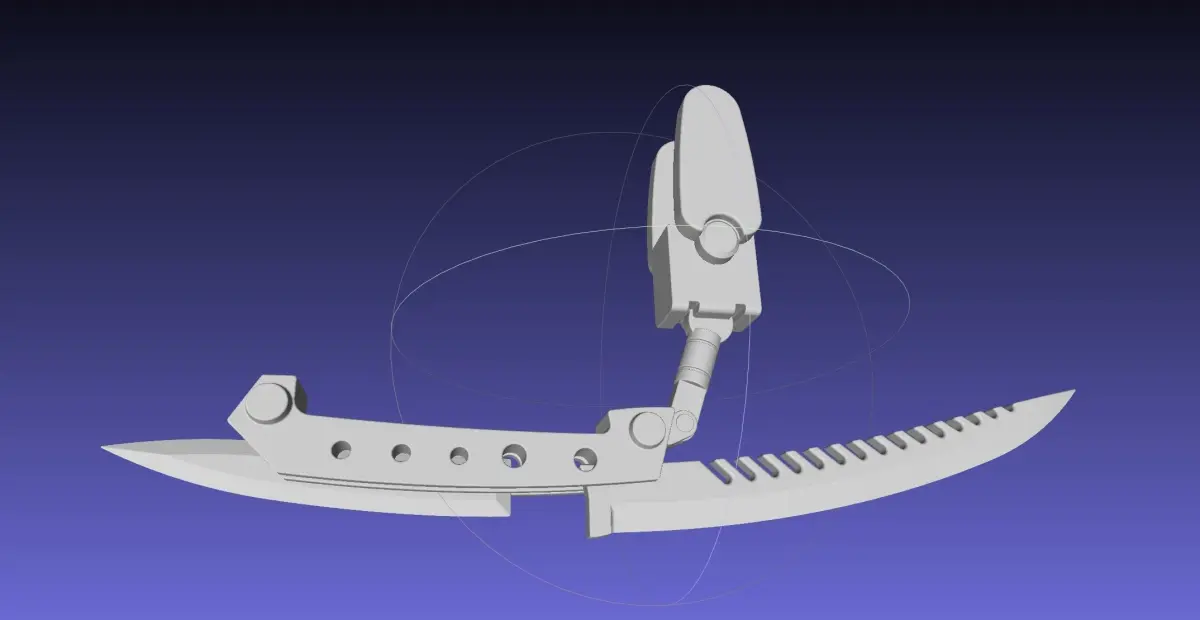 A 3d-printable model of the manga version of the initial Damaskus Blade from Alita Battle Angelthe full model is about 620mm long and divided up into 6 parts that can be assembled using 3mm steel wire and keysthis only includes the left arm version, but the model can be mirrored and scaled in slicerit inncludes both parametric files for editing and printable stl files