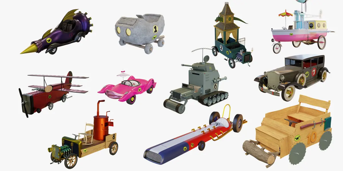I modeled these Cars from Wacky Races Cartoon, I created a diferent look and made a much more realistic design to be use in any animation and race game just take out the sticks.