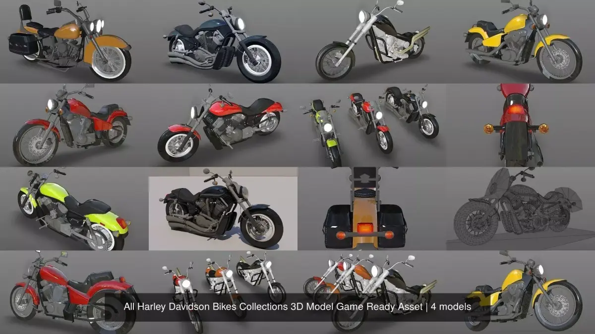 All Harley Davidson Bikes Collections 3D Model Game Ready AssetsNewley Harley Davidson Bikes 3D Models Collections Game Ready Asset Heavy Bikes 3D Model Collections Game Ready Asset - Lowply Heavy Bike - Sports Bike for Racing Games and Other Project As you want like VR-AR- or 3d Printing. We have to doscuss how would you like it exported. Model formats: *.fbx (Multi Format) *.obj (Multi Format) *.3ds (Multi Format) *.c4d (Cinema 4D 11) *.dae *.Stl Alaso Include Textures ,