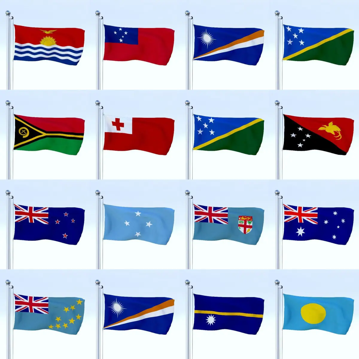 A model pack containing the flags of all Oceanian countries (14 flags). The models come in five formats:-.blend, rendered with cycles, as seen in the images, animated;-.obj, with materials applied;-.dae, with materials applied;-.stl, 3D print ready;-.fbx;The model pack contains an archive with separate folders for each country's flag, in which there are separate archives with each of the five different file formats for maximum convenience.Flags included (14): Australia; Federated States of Micronesia; Fiji; Kiribati; Marshall Islands; Nauru; New Zealand; Palau; Papua New Guinea; Samoa; Solomon Islands; Tonga; Tuvalu; Vanuatu.The 3d models were originally created in Blender 2.78 and rendered with Cycles.The models have materials applied in all formats, and are ready to import and render.For any problems please feel free to contact me.Don't forget to rate and enjoy!