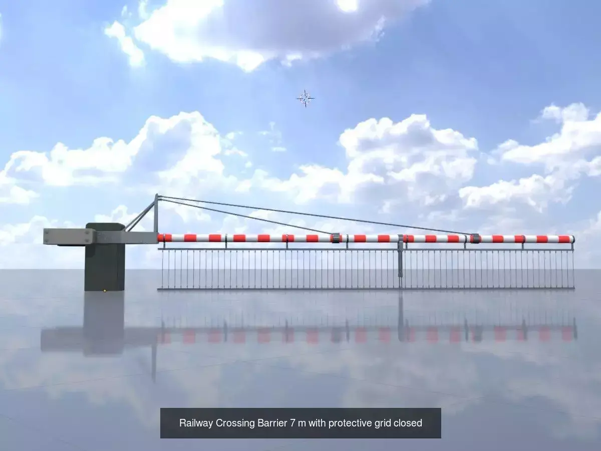 - Here you can see a 3D model of a closed railroad crossing gate with protective grid.